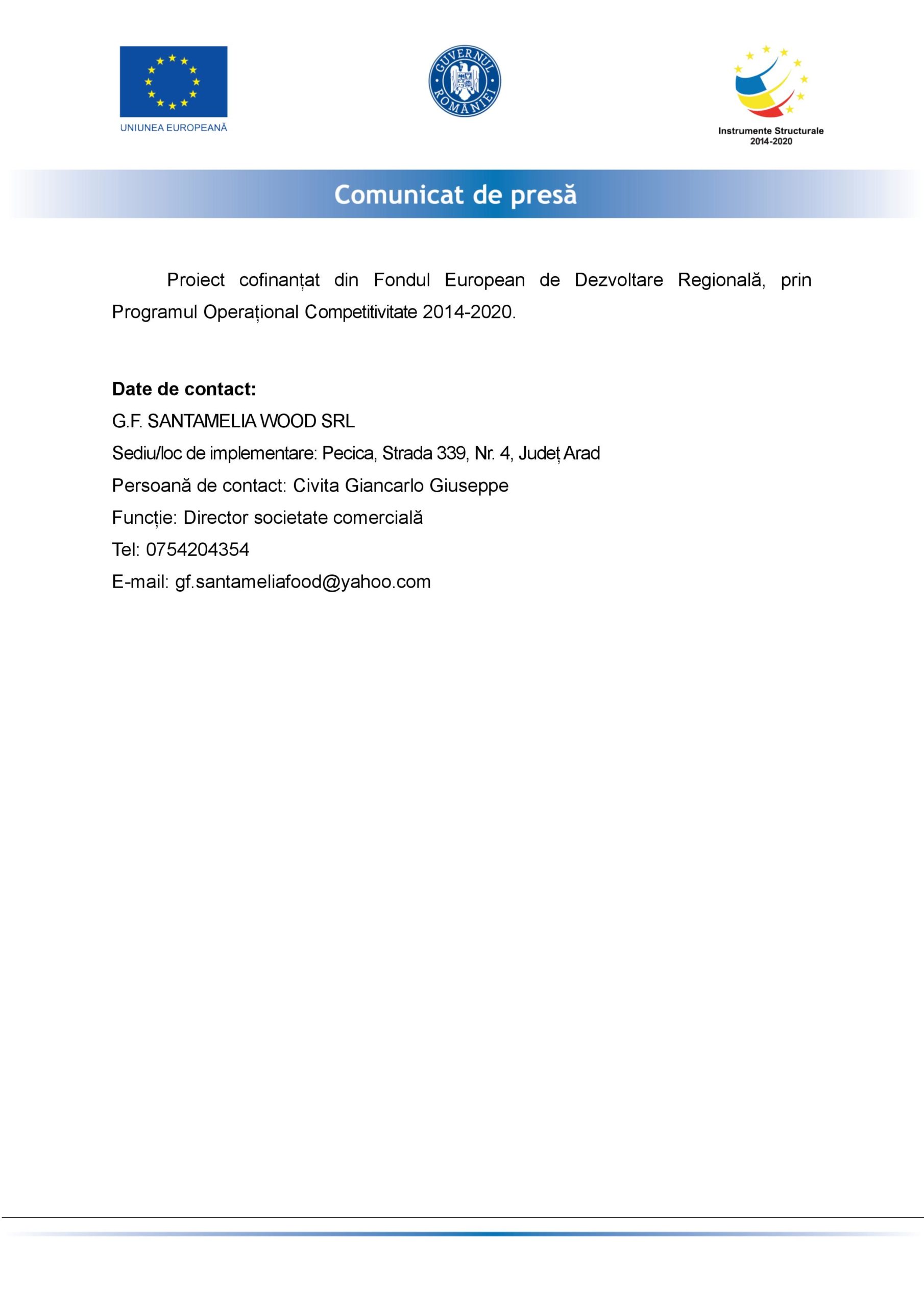 Societatea G.F. SANTAMELIA WOOD SRL anunță lansarea proiectului cu titlul ”Santamelia”. Societatea, în calitate de Beneficiar, a încheiat contractul de finanțare nerambursabilă nr. M2-2252/16.12.2020, cu Agenția pentru IMM, Atragere de Investiții și Promovarea Exportului Timișoara, în calitate de Administrator de program, aferent măsurii de finanțare „Granturi pentru capital de lucru acordate IMM-urilor” din cadrul schemei de ajutor de stat instituită prin OUG 130/2020 privind unele măsuri pentru acordarea de sprijin financiar din fonduri externe nerambursabile, aferente Programului Operațional Competitivitate 2014-2020, în contextul crizei provocate de Covid-19.