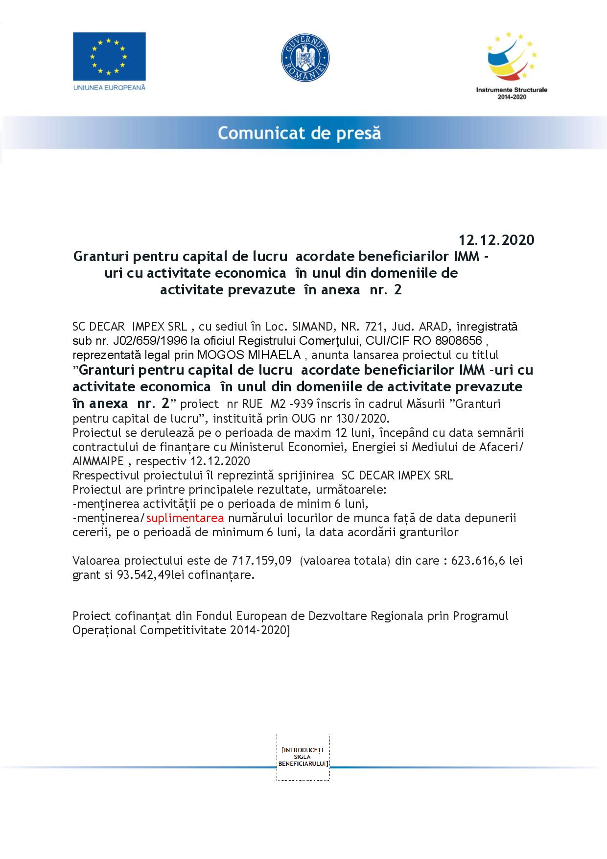 SC DECAR IMPEX SRL , cu sediul în Loc. SIMAND, NR. 721, Jud. ARAD, inregistrată sub nr. J02/659/1996 la oficiul Registrului Comerţului, CUI/CIF RO 8908656 , reprezentată legal prin MOGOS MIHAELA , anunta lansarea proiectul cu titlul ”Granturi pentru capital de lucru acordate beneficiarilor IMM -uri cu activitate economica în unul din domeniile de activitate prevazute în anexa nr. 2” proiect nr RUE M2 -939 înscris în cadrul Măsurii ”Granturi pentru capital de lucru”, instituită prin OUG nr 130/2020.