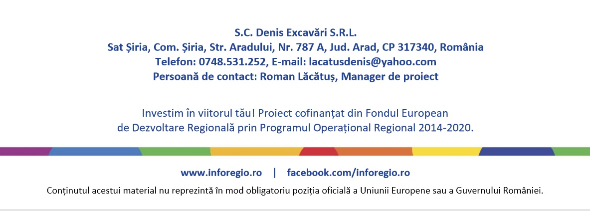 S.C. Denis Excavări S.R.L., în calitate de beneficiar, comunică lansarea proiectului „Achiziție de utilaj pentru dezvoltare”, cod SMIS 130772.