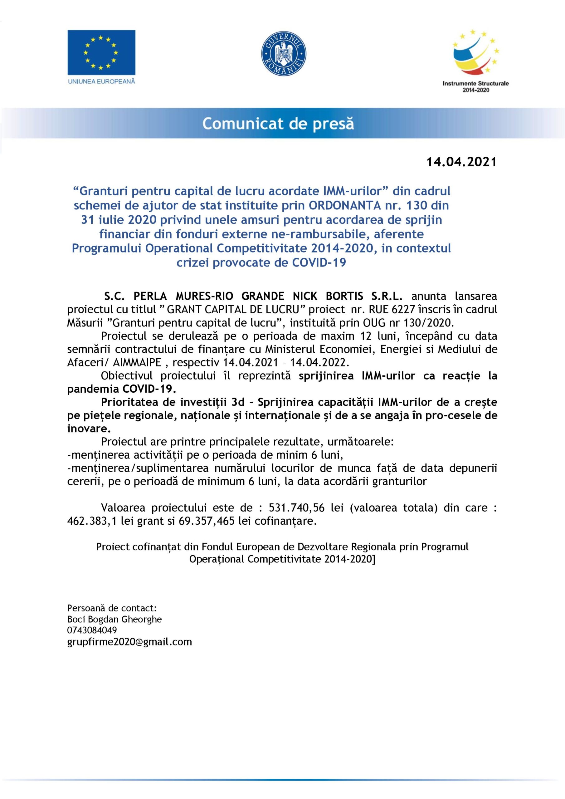 S.C. PERLA MURES-RIO GRANDE NICK BORTIS S.R.L. anunta lansarea proiectul cu titlul ” GRANT CAPITAL DE LUCRU” proiect nr. RUE 6227 înscris în cadrul Măsurii ”Granturi pentru capital de lucru”, instituită prin OUG nr 130/2020.