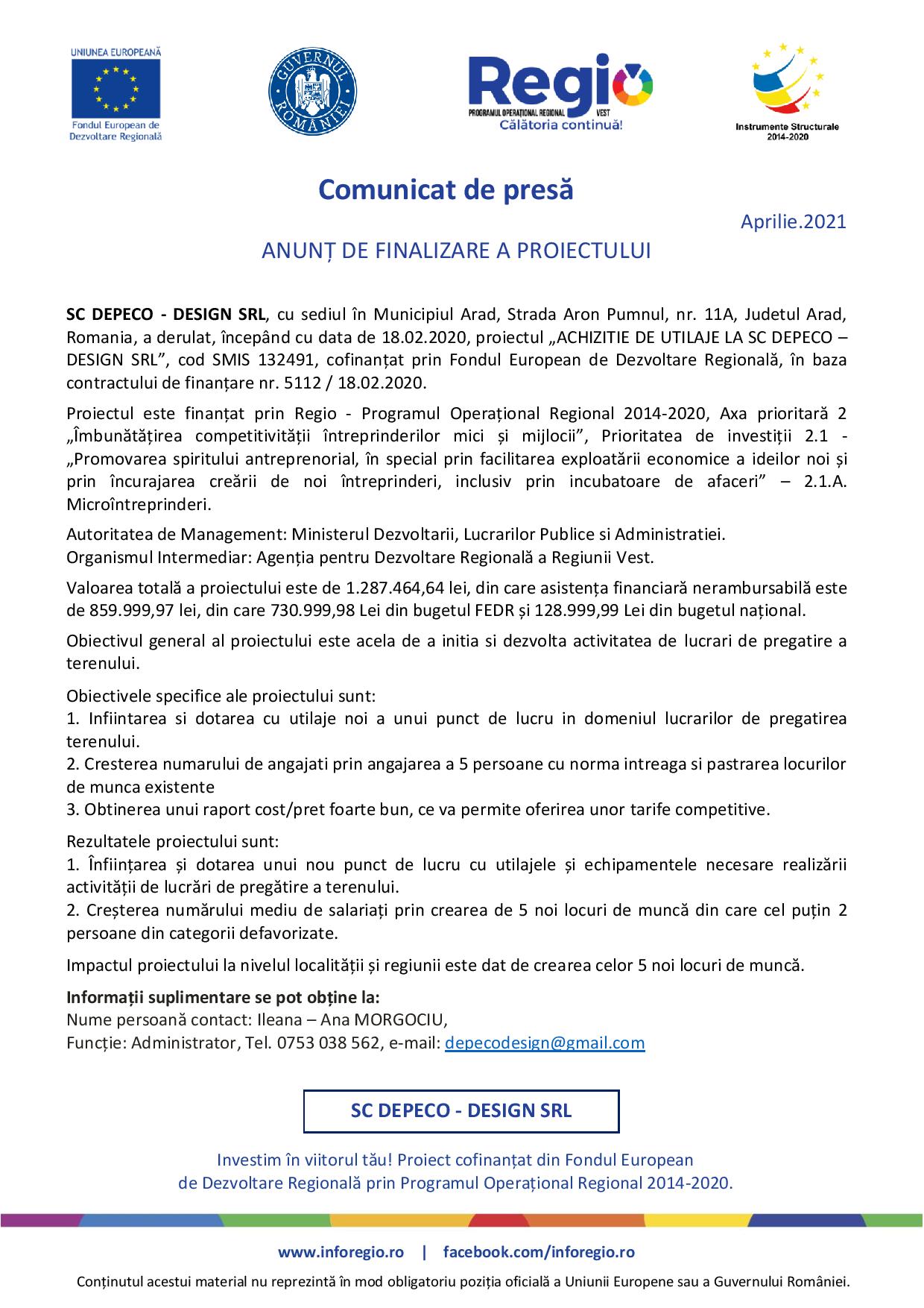 SC DEPECO – DESIGN SRL, cu sediul în Municipiul Arad, Strada Aron Pumnul, nr. 11A, Judetul Arad, Romania, a derulat, începând cu data de 18.02.2020, proiectul „ACHIZITIE DE UTILAJE LA SC DEPECO – DESIGN SRL”, cod SMIS 132491, cofinanțat prin Fondul European de Dezvoltare Regională, în baza contractului de finanțare nr. 5112 / 18.02.2020.