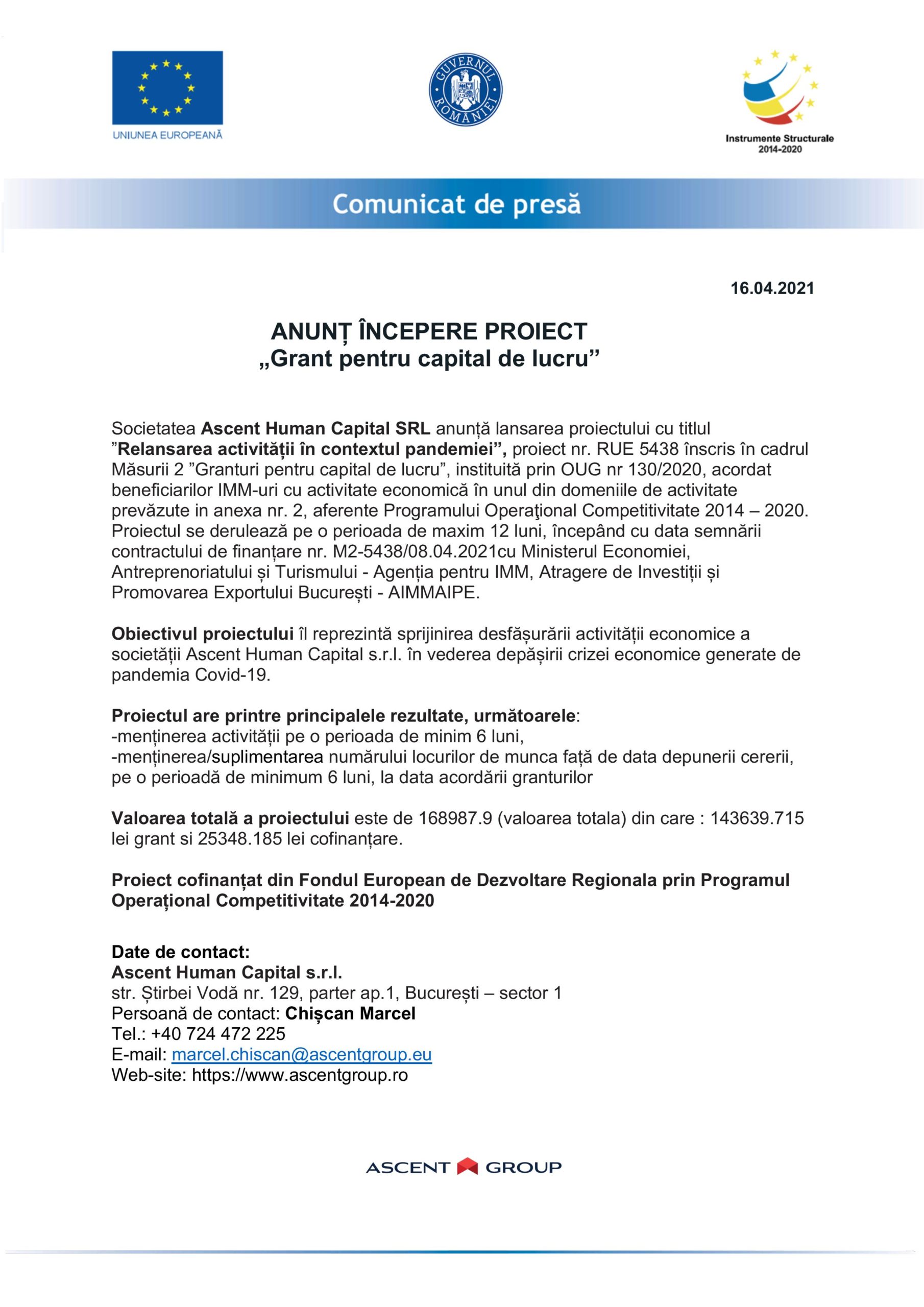Societatea Ascent Human Capital SRL anunță lansarea proiectului cu titlul