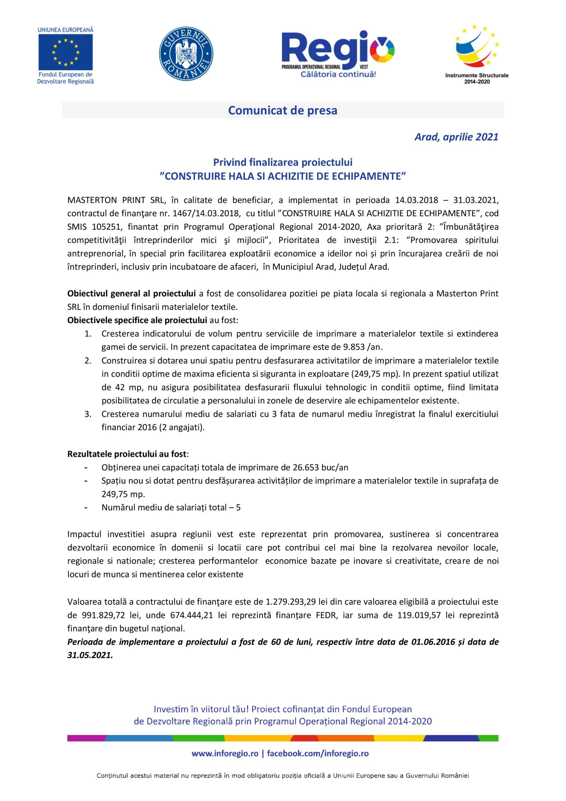 MASTERTON PRINT SRL, în calitate de beneficiar, a implementat in perioada 14.03.2018 – 31.03.2021, contractul de finanţare nr. 1467/14.03.2018, cu titlul ”CONSTRUIRE HALA SI ACHIZITIE DE ECHIPAMENTE”, cod SMIS 105251, finantat prin Programul Operaţional Regional 2014-2020, Axa prioritară 2: ”Îmbunătăţirea competitivităţii întreprinderilor mici şi mijlocii”, Prioritatea de investiţii 2.1: “Promovarea spiritului antreprenorial, în special prin facilitarea exploatării economice a ideilor noi și prin încurajarea creării de noi întreprinderi, inclusiv prin incubatoare de afaceri, în Municipiul Arad, Județul Arad.