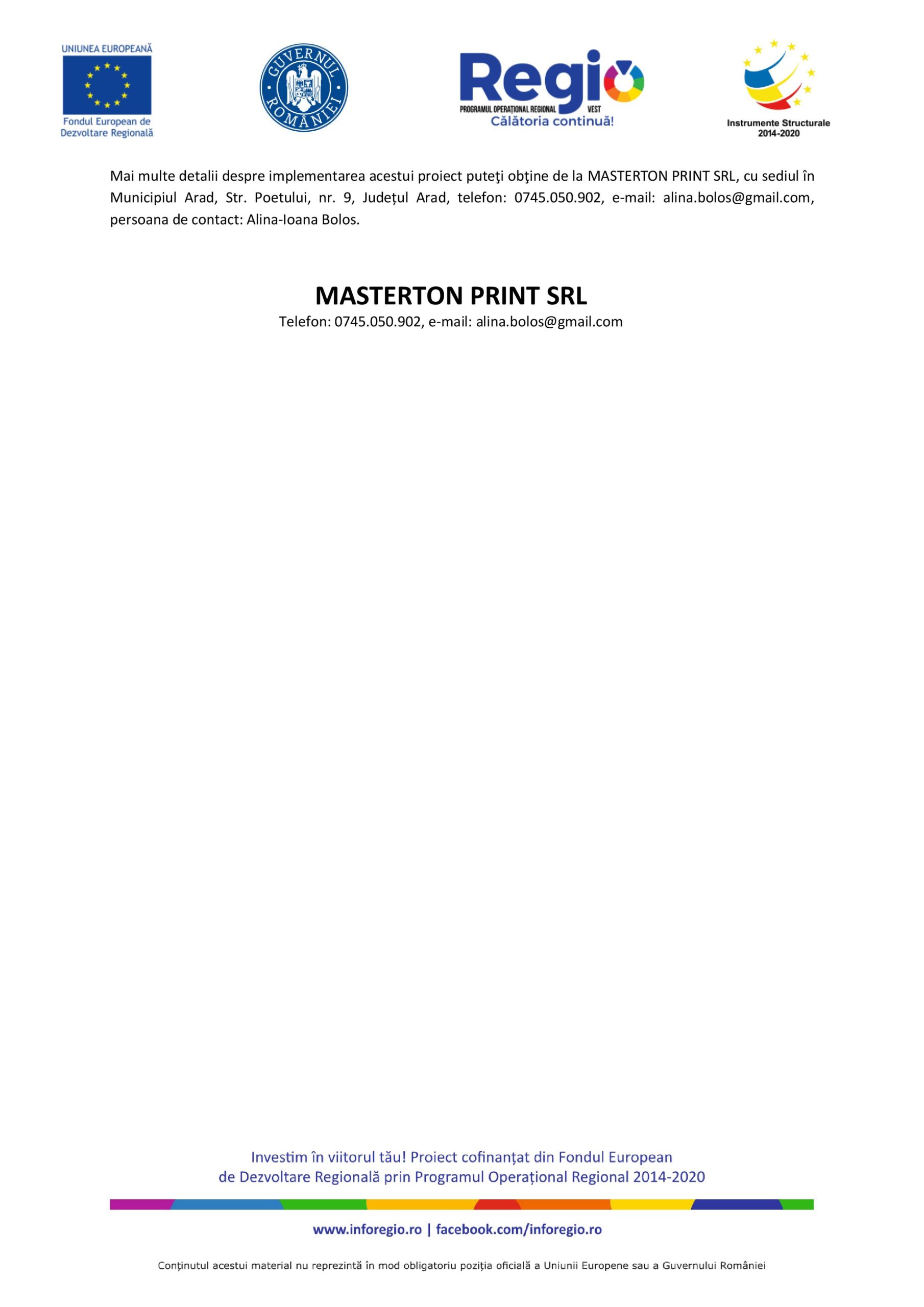 Mai multe detalii despre implementarea acestui proiect puteţi obţine de la MASTERTON PRINT SRL, cu sediul în Municipiul Arad, Str. Poetului, nr. 9, Județul Arad, telefon: 0745.050.902, e-mail: alina.bolos@gmail.com, persoana de contact: Alina-Ioana Bolos.