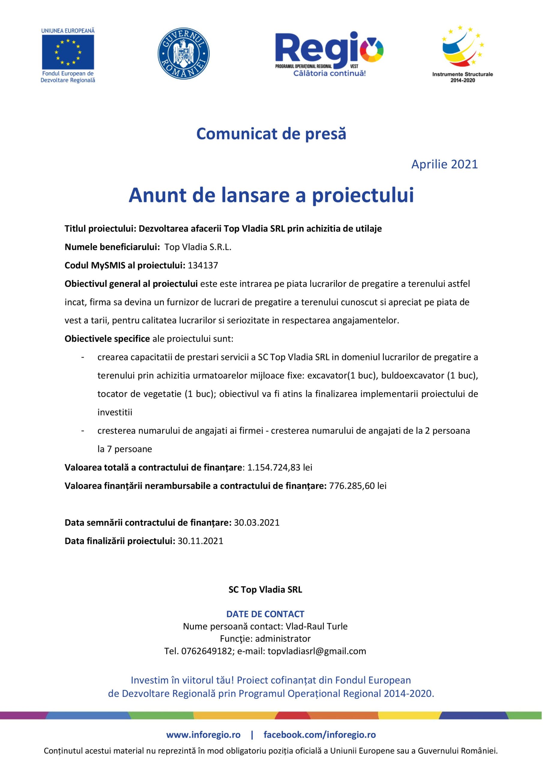 Titlul proiectului: Dezvoltarea afacerii Top Vladia SRL prin achizitia de utilaje