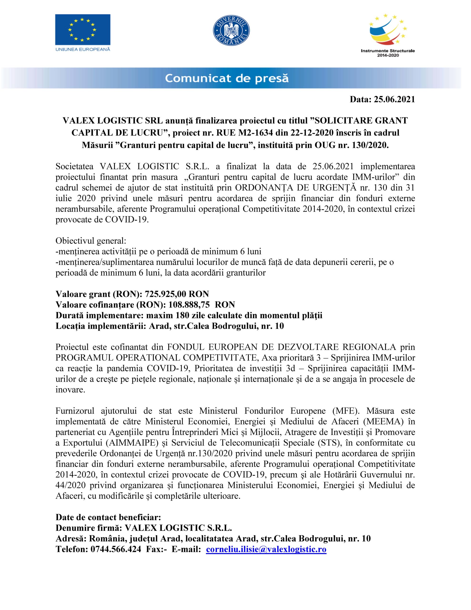 VALEX LOGISTIC SRL anunță finalizareaproiectul cu titlul ”SOLICITARE GRANT CAPITAL DE LUCRU”, proiect nr. RUE M2-1634 din 22-12-2020înscrisîncadrulMăsurii ”Granturi pentru capital de lucru”, instituită prin OUG nr. 130/2020.
