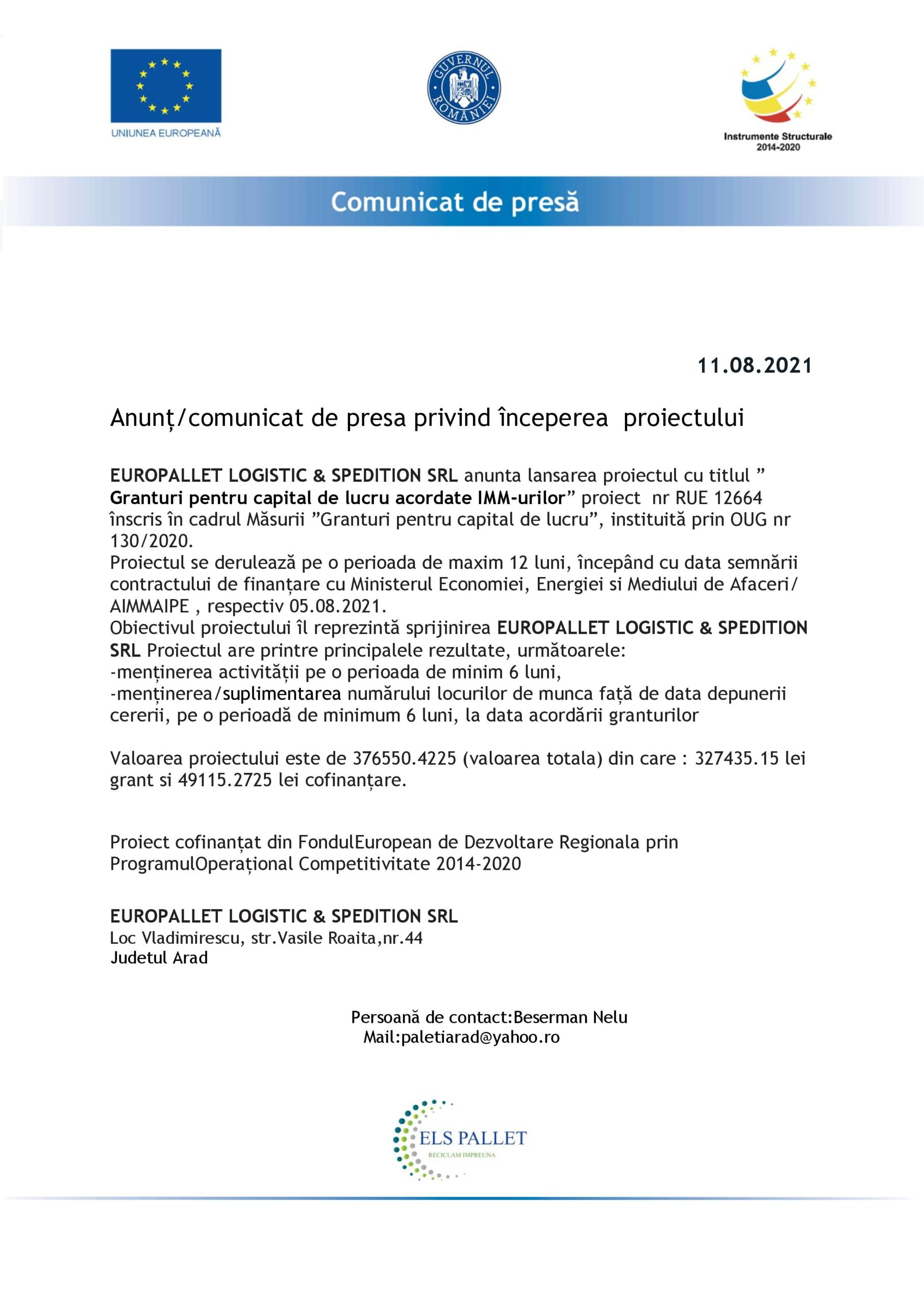 EUROPALLET LOGISTIC & SPEDITION SRL anunta lansarea proiectul cu titlul ” Granturi pentru capital de lucru acordate IMM-urilor” proiect nr RUE 12664 înscris în cadrul Măsurii ”Granturi pentru capital de lucru”, instituită prin OUG nr 130/2020.