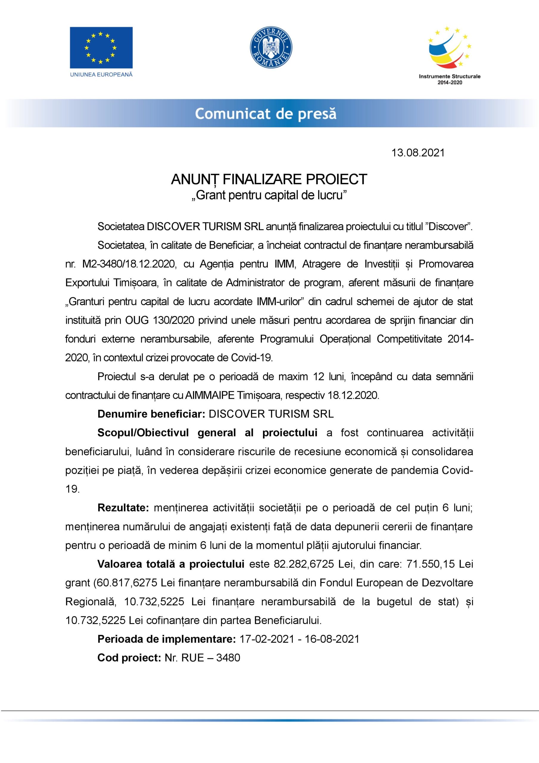 Societatea DISCOVER TURISM SRL anunță finalizarea proiectului cu titlul ”Discover”. Societatea, în calitate de Beneficiar, a încheiat contractul de finanțare nerambursabilă nr. M2-3480/18.12.2020, cu Agenția pentru IMM, Atragere de Investiții și Promovarea Exportului Timișoara, în calitate de Administrator de program, aferent măsurii de finanțare „Granturi pentru capital de lucru acordate IMM-urilor” din cadrul schemei de ajutor de stat instituită prin OUG 130/2020 privind unele măsuri pentru acordarea de sprijin financiar din fonduri externe nerambursabile, aferente Programului Operațional Competitivitate 2014-2020, în contextul crizei provocate de Covid-19.