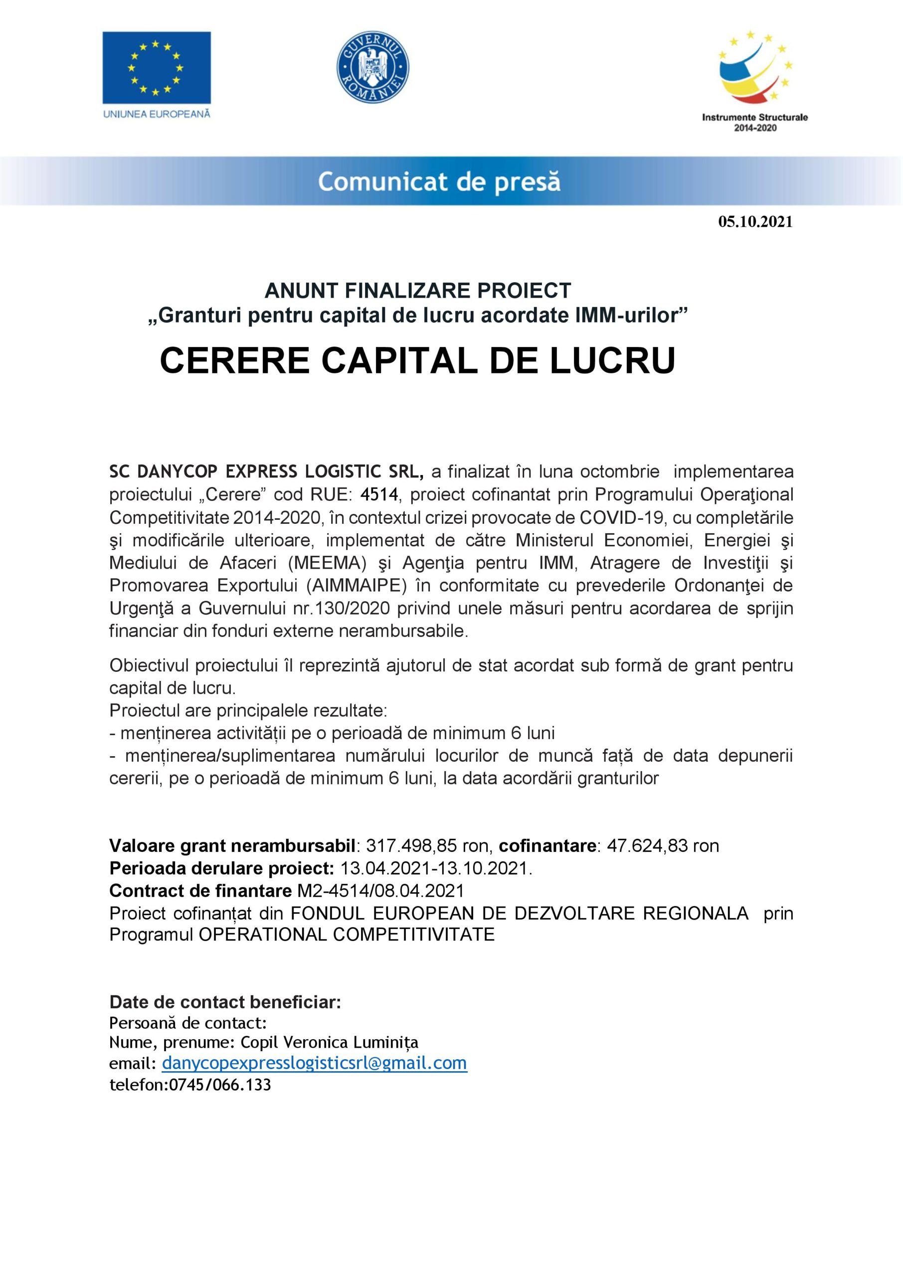 SC DANYCOP EXPRESS LOGISTIC SRL, a finalizat în luna octombrie implementarea proiectului „Cerere” cod RUE: 4514, proiect cofinantat prin Programului Operaţional Competitivitate 2014-2020, în contextul crizei provocate de COVID-19, cu completările şi modificările ulterioare, implementat de către Ministerul Economiei, Energiei şi Mediului de Afaceri (MEEMA) şi Agenţia pentru IMM, Atragere de Investiţii şi Promovarea Exportului (AIMMAIPE) în conformitate cu prevederile Ordonanţei de Urgenţă a Guvernului nr.130/2020 privind unele măsuri pentru acordarea de sprijin financiar din fonduri externe nerambursabile.