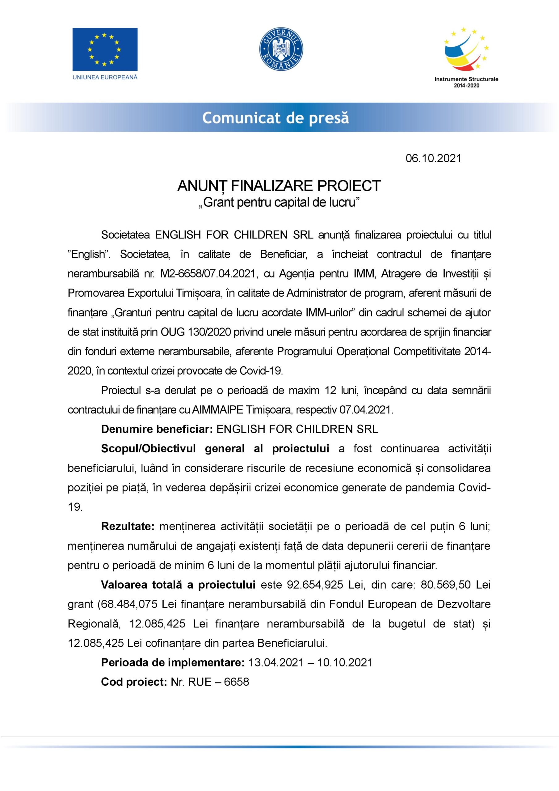 Societatea ENGLISH FOR CHILDREN SRL anunță finalizarea proiectului cu titlul ”English”. Societatea, în calitate de Beneficiar, a încheiat contractul de finanțare nerambursabilă nr. M2-6658/07.04.2021, cu Agenția pentru IMM, Atragere de Investiții și Promovarea Exportului Timișoara, în calitate de Administrator de program, aferent măsurii de finanțare „Granturi pentru capital de lucru acordate IMM-urilor” din cadrul schemei de ajutor de stat instituită prin OUG 130/2020 privind unele măsuri pentru acordarea de sprijin financiar din fonduri externe nerambursabile, aferente Programului Operațional Competitivitate 2014-2020, în contextul crizei provocate de Covid-19.