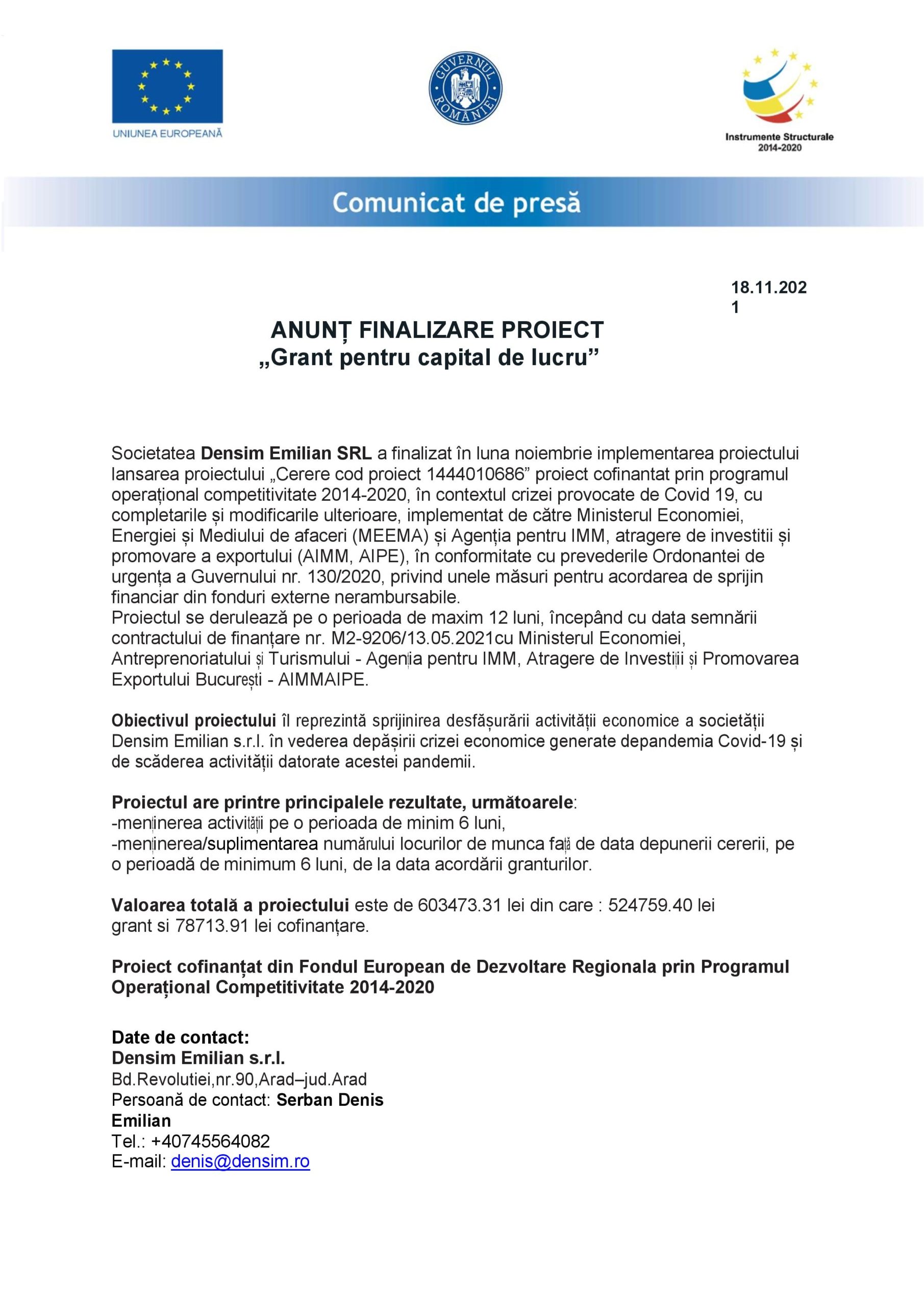 Societatea Densim Emilian SRL a finalizat în luna noiembrie implementarea proiectului lansarea proiectului „Cerere cod proiect 1444010686” proiect cofinantat prin programul operațional competitivitate 2014-2020, în contextul crizei provocate de Covid 19, cu completarile și modificarile ulterioare, implementat de către Ministerul Economiei, Energiei și Mediului de afaceri (MEEMA) și Agenția pentru IMM, atragere de investitii și promovare a exportului (AIMM, AIPE), în conformitate cu prevederile Ordonantei de urgența a Guvernului nr. 130/2020, privind unele măsuri pentru acordarea de sprijin financiar din fonduri externe nerambursabile.