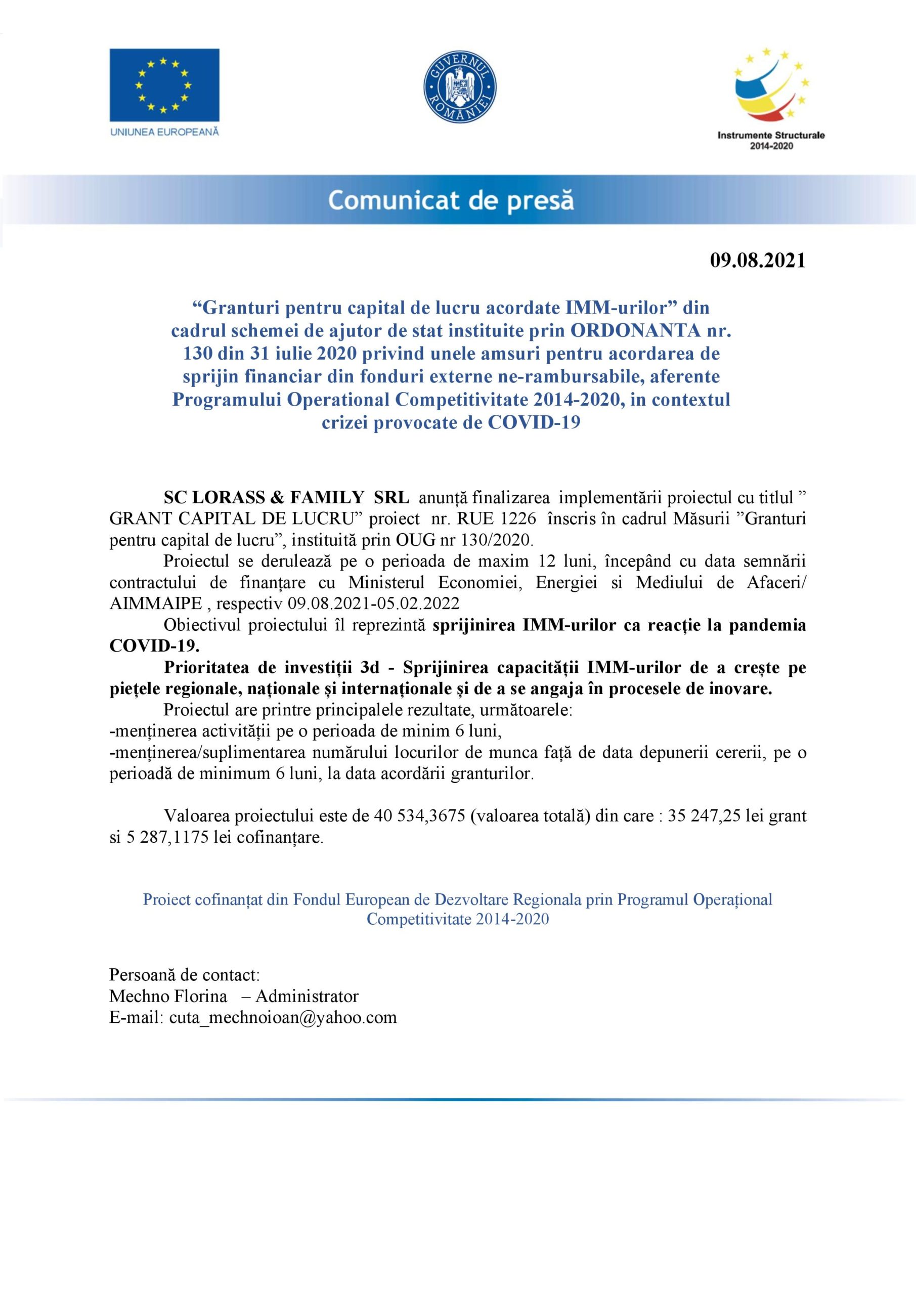 SC LORASS & FAMILY SRL anunță finalizarea implementării proiectul cu titlul ” GRANT CAPITAL DE LUCRU” proiect nr. RUE 1226 înscris în cadrul Măsurii ”Granturi pentru capital de lucru”, instituită prin OUG nr 130/2020.