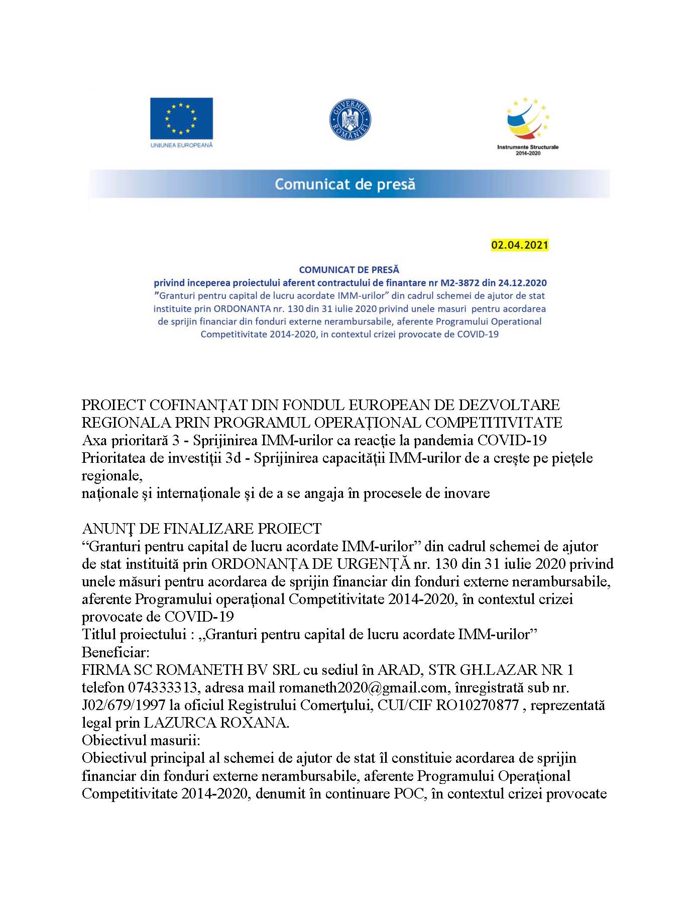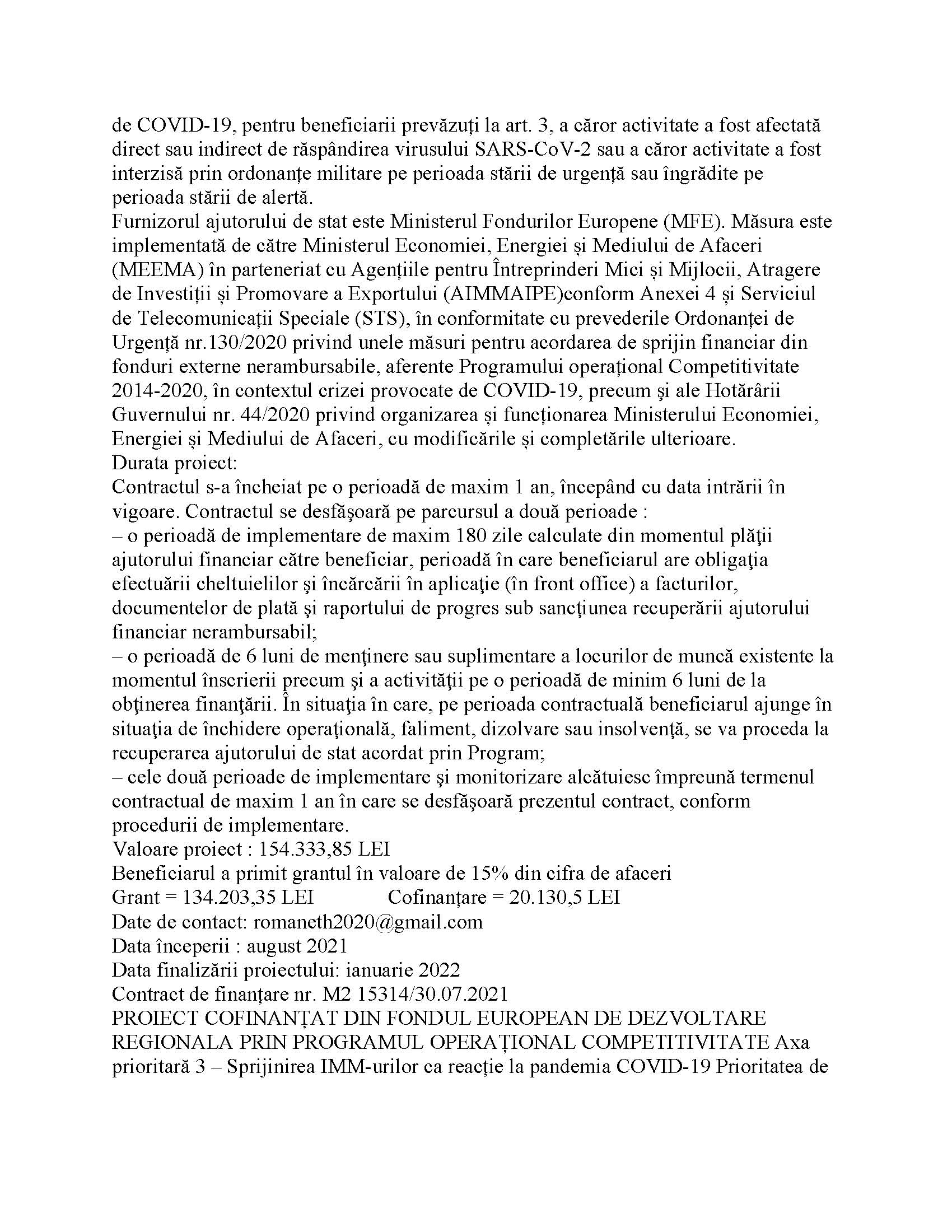 FIRMA SC ROMANETH BV SRL cu sediul în ARAD, STR GH.LAZAR NR 1 telefon 074333313, adresa mail romaneth2020@gmail.com, înregistrată sub nr. J02/679/1997 la oficiul Registrului Comerţului, CUI/CIF RO10270877 , reprezentată legal prin LAZURCA ROXANA.