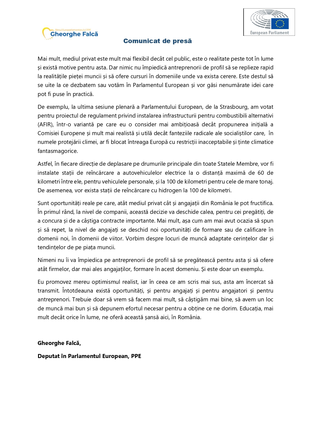 De exemplu, la ultima sesiune plenară a Parlamentului European, de la Strasbourg, am votat pentru proiectul de regulament privind instalarea infrastructurii pentru combustibili alternativi (AFIR), într-o variantă pe care eu o consider mai ambițioasă decât propunerea inițială a Comisiei Europene și mult mai realistă și utilă decât fanteziile radicale ale socialiștilor care, în numele protejării climei, ar fi blocat întreaga Europă cu restricții inacceptabile și ținte climatice fantasmagorice.