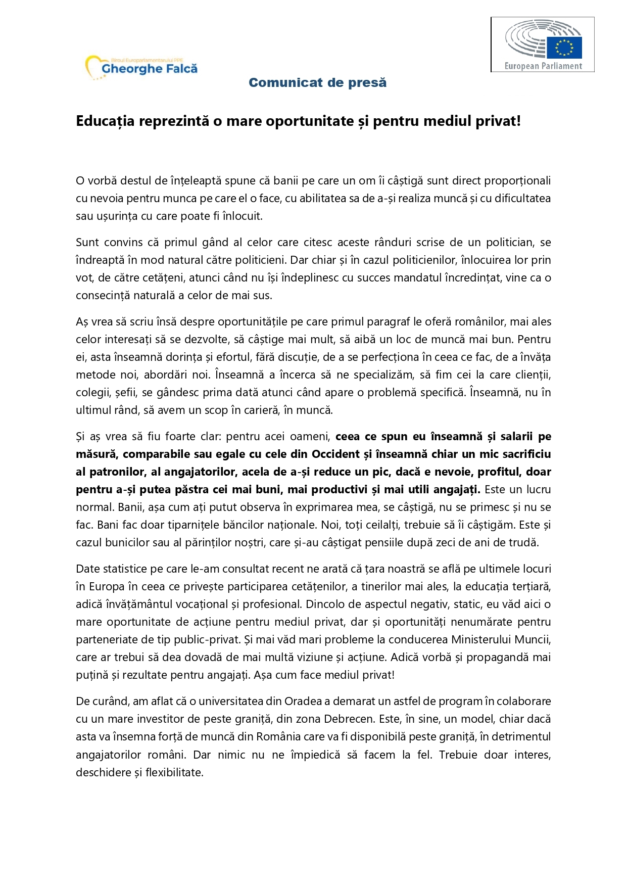 Și aș vrea să fiu foarte clar: pentru acei oameni, ceea ce spun eu înseamnă și salarii pe măsură, comparabile sau egale cu cele din Occident și înseamnă chiar un mic sacrificiu al patronilor, al angajatorilor, acela de a-și reduce un pic, dacă e nevoie, profitul, doar pentru a-și putea păstra cei mai buni, mai productivi și mai utili angajați. Este un lucru normal. Banii, așa cum ați putut observa în exprimarea mea, se câștigă, nu se primesc și nu se fac. Bani fac doar tiparnițele băncilor naționale. Noi, toți ceilalți, trebuie să îi câștigăm. Este și cazul bunicilor sau al părinților noștri, care și-au câștigat pensiile după zeci de ani de trudă.