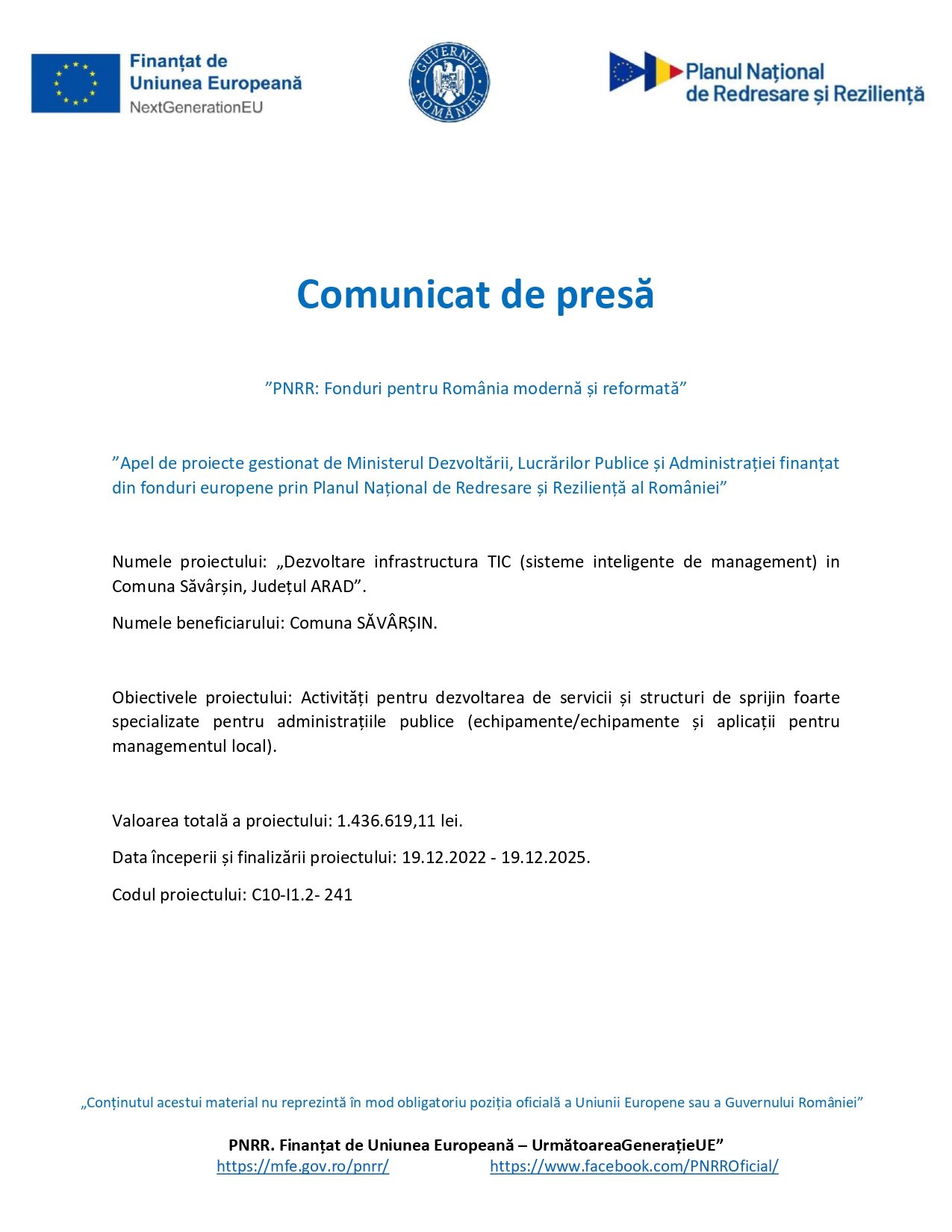 ADVERTORIAL. Numele proiectului: „Dezvoltare infrastructura TIC (sisteme inteligente de management) in Comuna Săvârșin, Județul ARAD”.