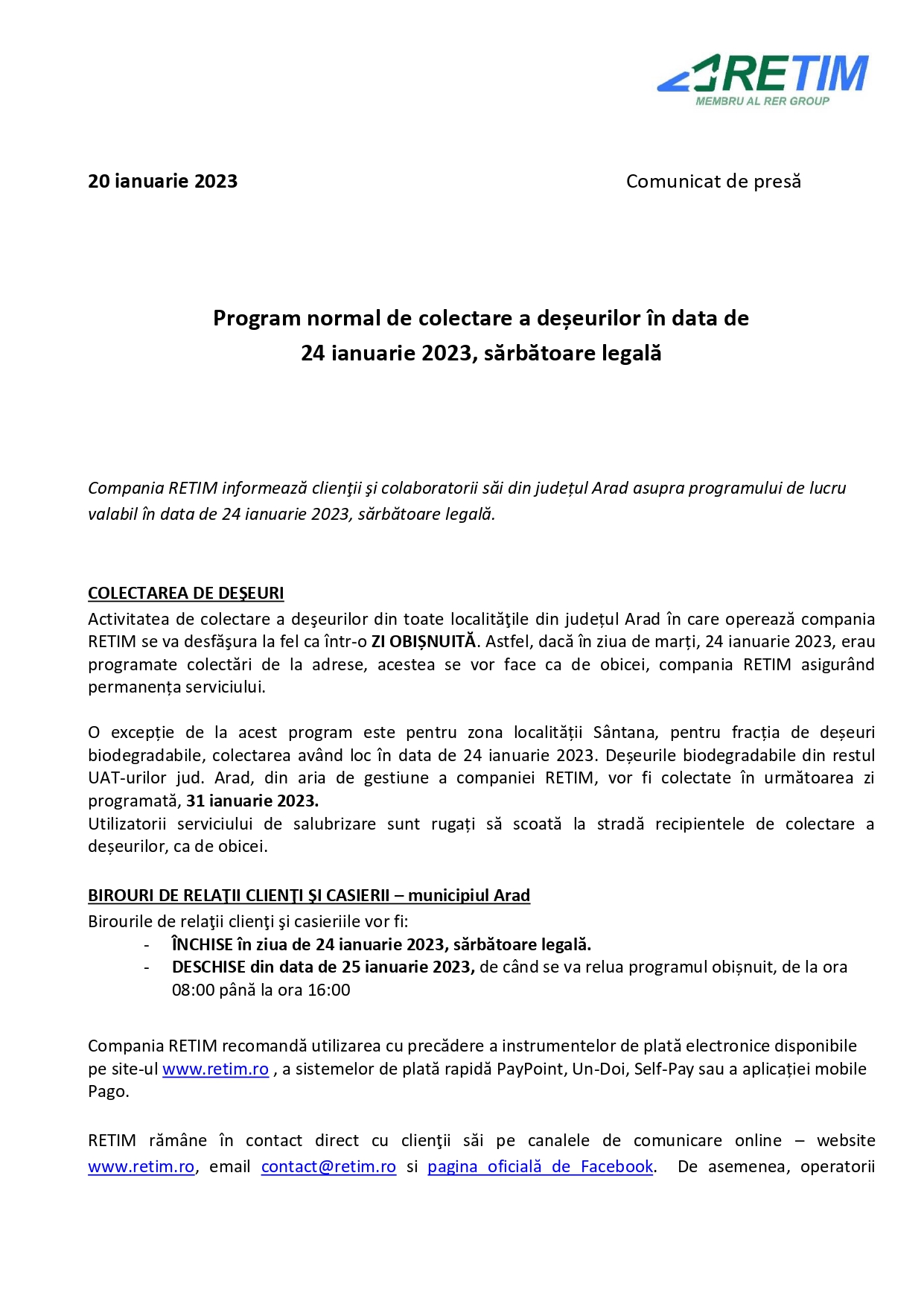 ADVERTORIAL. Compania RETIM informează clienţii şi colaboratorii săi din județul Arad asupra programului de lucru valabil în data de 24 ianuarie 2023, sărbătoare legală.