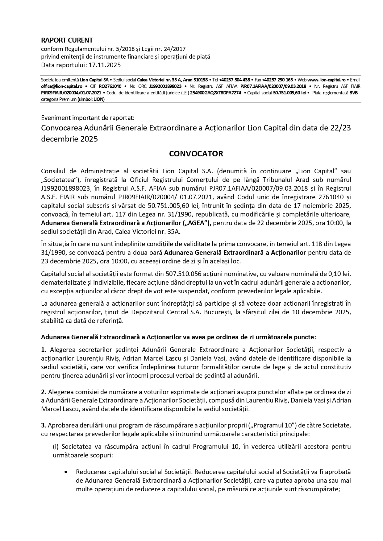 Consiliul de Administrație al societății Lion Capital S.A. (denumită în continuare „Lion Capital” sau „Societatea”), înregistrată la Oficiul Registrului Comerțului de pe lângă Tribunalul Arad sub numărul J1992001898023, în Registrul A.S.F. AFIAA sub numărul PJR07.1AFIAA/020007/09.03.2018 și în Registrul A.S.F. FIAIR sub numărul PJR09FIAIR/020004/ 01.07.2021, având Codul unic de înregistrare 2761040 și capitalul social subscris și vărsat de 50.751.005,60 lei, întrunit în ședința din data de 17 noiembrie 2025, convoacă, în temeiul art. 117 din Legea nr. 31/1990, republicată, cu modificările și completările ulterioare, Adunarea Generală Extraordinară a Acționarilor („AGEA”), pentru data de 22 decembrie 2025, ora 10:00, la sediul societății din Arad, Calea Victoriei nr. 35A.