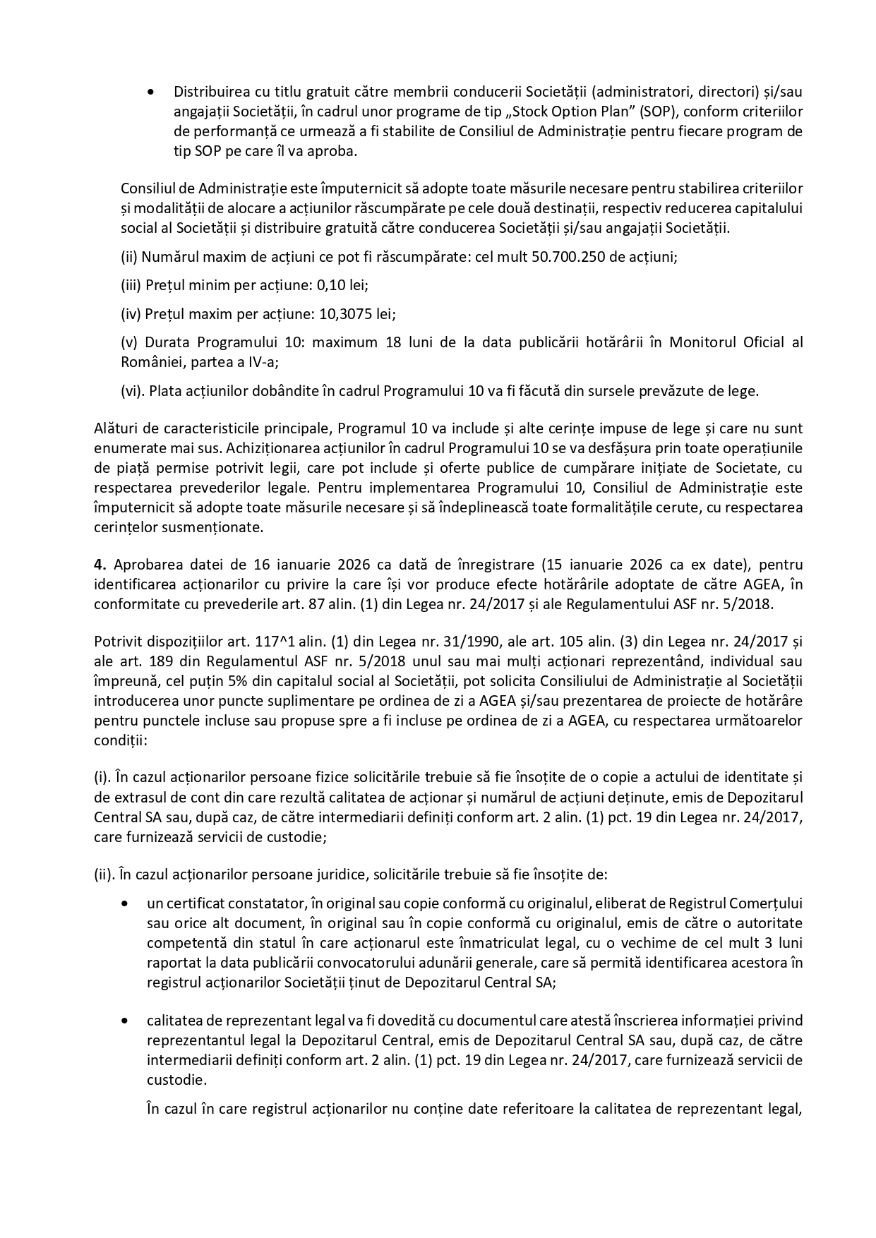 - Aprobarea datei de 16 ianuarie 2026 ca dată de înregistrare (15 ianuarie 2026 ca ex date), pentru identificarea acționarilor cu privire la care își vor produce efecte hotărârile adoptate de către AGEA, în conformitate cu prevederile art. 87 alin. (1) din Legea nr. 24/2017 și ale Regulamentului ASF nr. 5/2018.