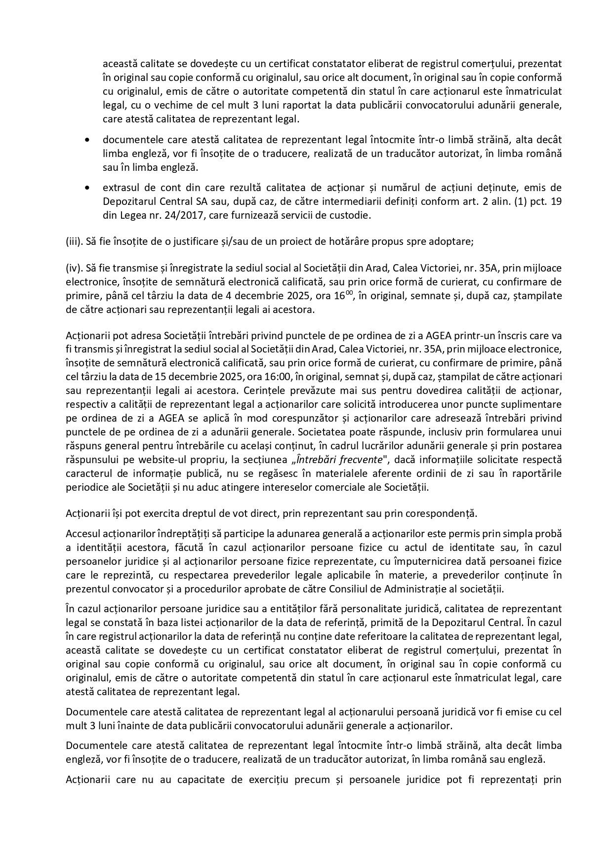 (iv). Să fie transmise și înregistrate la sediul social al Societății din Arad, Calea Victoriei, nr. 35A, prin mijloace electronice, însoțite de semnătură electronică calificată, sau prin orice formă de curierat, cu confirmare de primire, până cel târziu la data de 4 decembrie 2025, ora 1600, în original, semnate și, după caz, ștampilate de către acționari sau reprezentanții legali ai acestora.