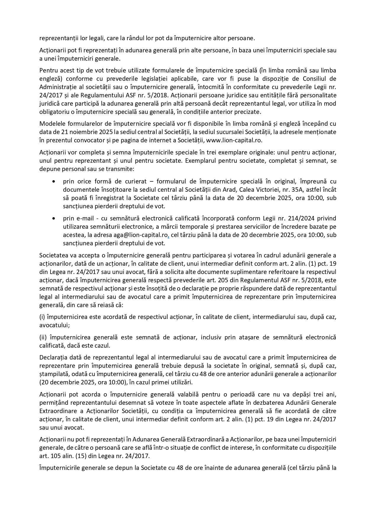 - prin e-mail – cu semnătură electronică calificată încorporată conform Legii nr. 214/2024 privind utilizarea semnăturii electronice, a mărcii temporale și prestarea serviciilor de încredere bazate pe acestea, la adresa aga@lion-capital.ro, cel târziu până la data de 20 decembrie 2025, ora 10:00, sub sancțiunea pierderii dreptului de vot.