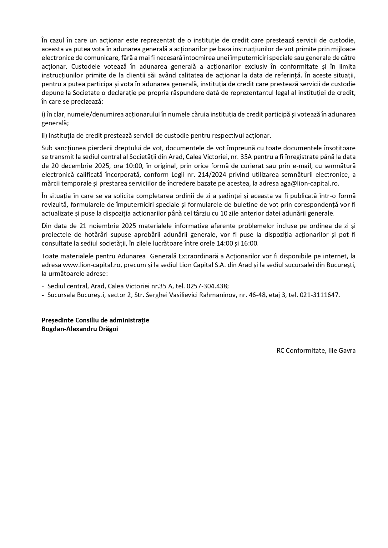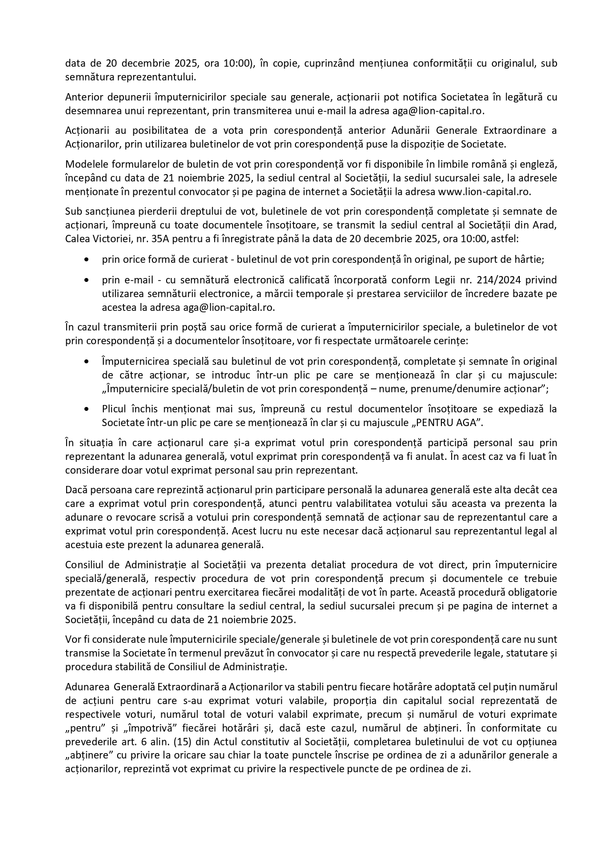 Sub sancțiunea pierderii dreptului de vot, documentele de vot împreună cu toate documentele însoțitoare se transmit la sediul central al Societății din Arad, Calea Victoriei, nr. 35A pentru a fi înregistrate până la data de 20 decembrie 2025, ora 10:00, în original, prin orice formă de curierat sau prin e-mail, cu semnătură electronică calificată încorporată, conform Legii nr. 214/2024 privind utilizarea semnăturii electronice, a mărcii temporale și prestarea serviciilor de încredere bazate pe acestea, la adresa aga@lion-capital.ro.