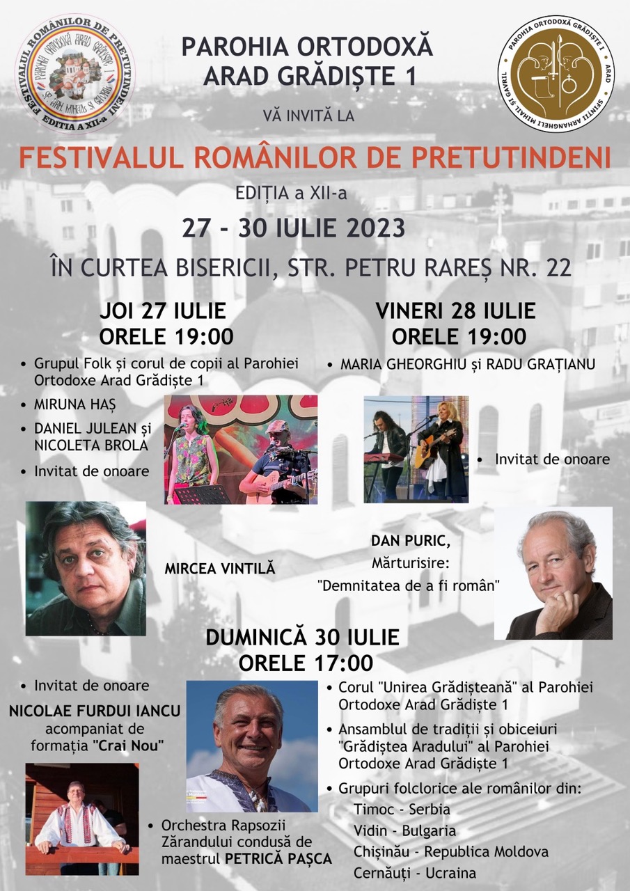 Ajuns la cea de-a XII-a ediție, festivalul promite să fie o adevărată sărbătoare a culturii românești, aducând împreună artiști consacrați, ansambluri folclorice și români din diverse regiuni istorice. Pe scena festivalului vor urca nume mari din lumea muzicii, care vor încânta inimile publicului prezent: Daniel Julean și Nicoleta Brola, Mircea Vintilă, Maria Gheorghiu și Radu Grațianu, Petrică Pașca cu Rapsozii Zărandului și nu în ultimul rând, Nicolae Furdui Iancu. Pe lângă spectacolele muzicale, festivalul va fi încununat cu o prelegere susținută de celebrul actor și gânditor, Dan Puric. Conferința sa promite să aducă în prim-plan subiecte de actualitate, îmbinând cu măiestrie spiritualitatea, cultura și demnitatea românească. Pe lângă recitalurile muzicale, ansamblurile folclorice invitate vor încânta publicul cu spectacole de dansuri specifice zonelor etnografice de unde provin, oferind o călătorie plină de culoare și veselie prin tradițiile autentice ale României. Cei prezenți la eveniment vor avea ocazia să descopere frumusețea și diversitatea culturală din regiunile Timoc, Vidin, Basarabia și Cernăuți. Ansamblul și corurile parohiei au pregătit momente artistice pentru cei prezenți și pentru invitații de peste hotare.