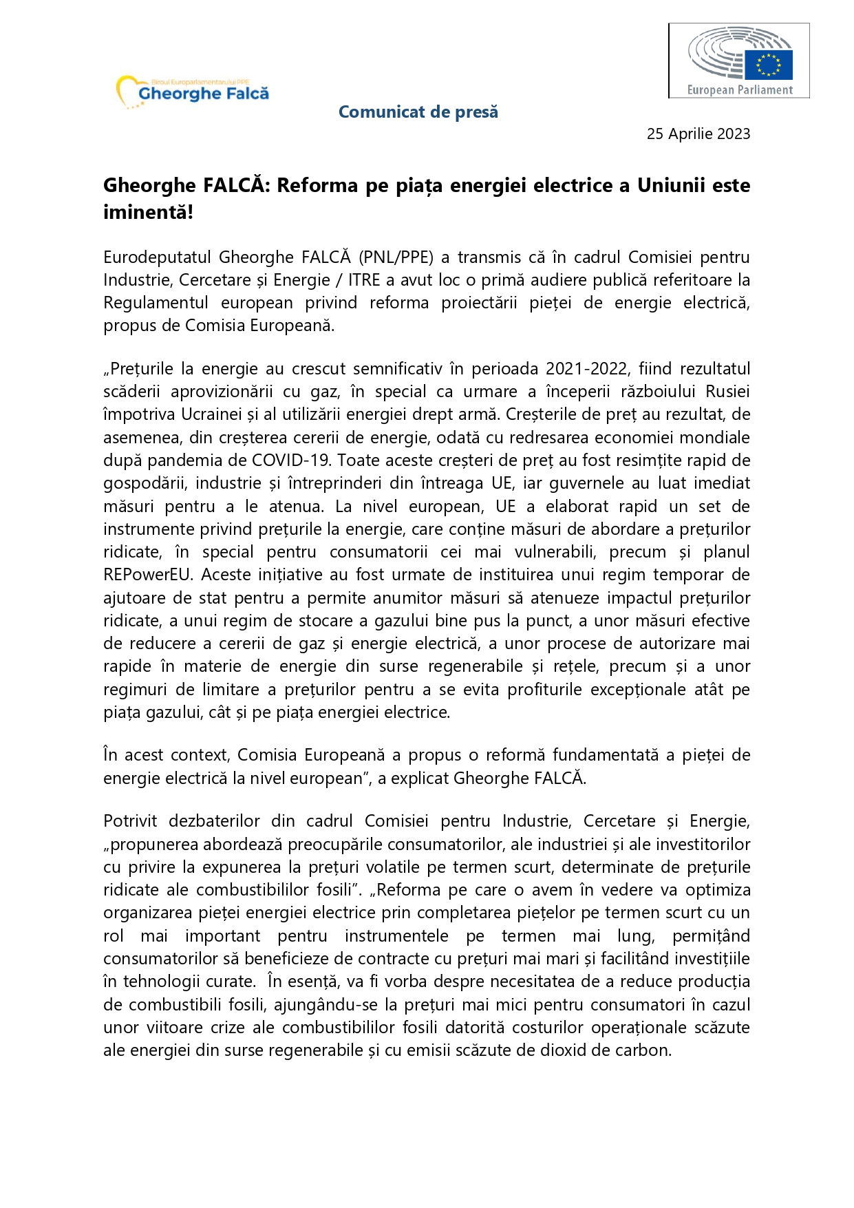 În acest context, Comisia Europeană a propus o reformă fundamentată a pieței de energie electrică la nivel european”, a explicat Gheorghe FALCĂ.