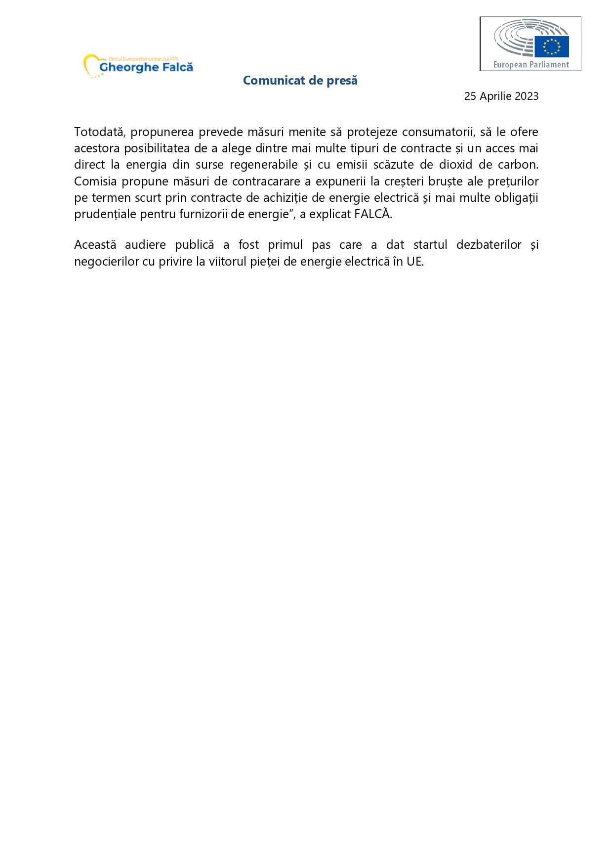 Totodată, propunerea prevede măsuri menite să protejeze consumatorii, să le ofere acestora posibilitatea de a alege dintre mai multe tipuri de contracte și un acces mai direct la energia din surse regenerabile și cu emisii scăzute de dioxid de carbon. Comisia propune măsuri de contracarare a expunerii la creșteri bruște ale prețurilor pe termen scurt prin contracte de achiziție de energie electrică și mai multe obligații prudențiale pentru furnizorii de energie”, a explicat FALCĂ.