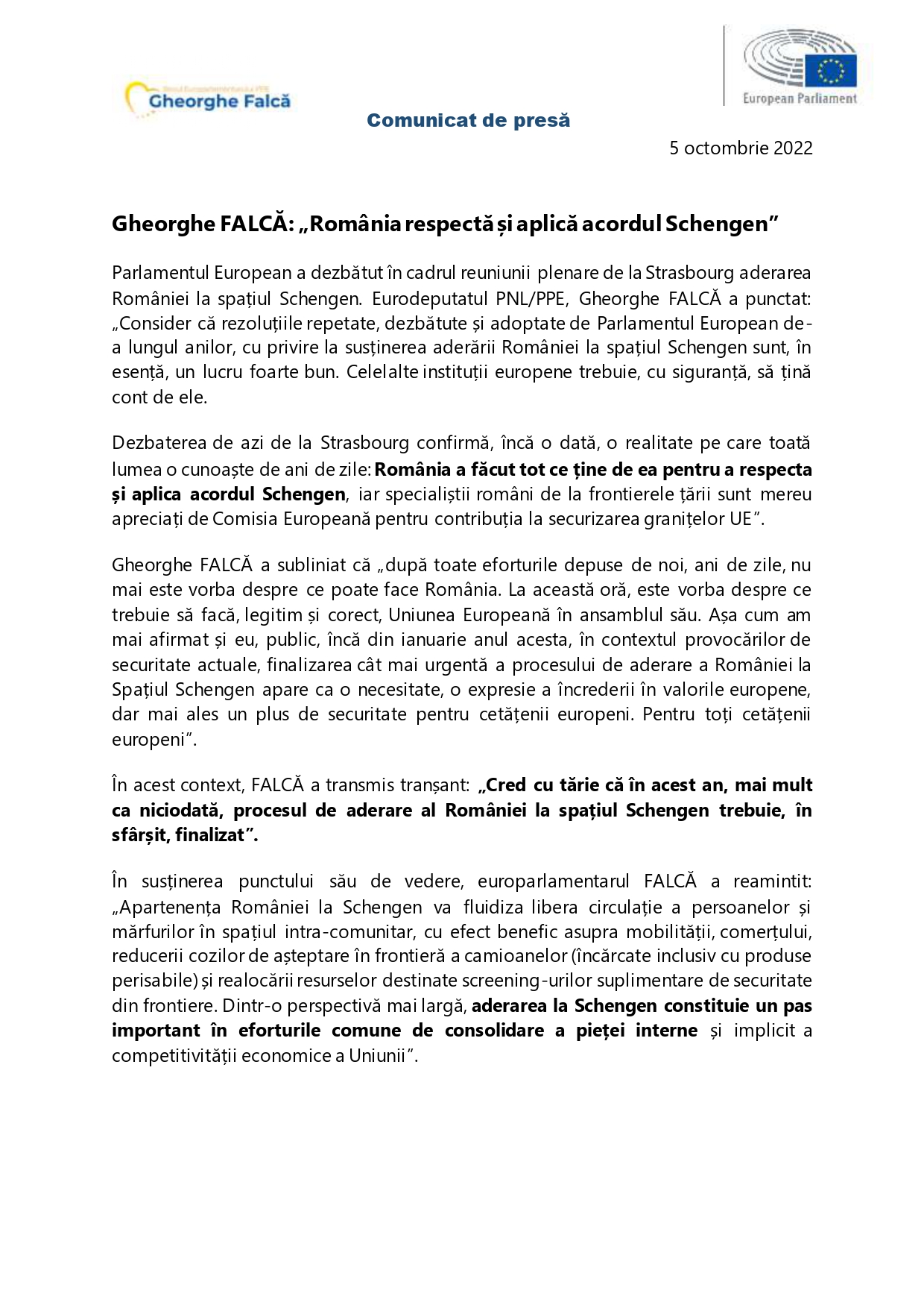 În susținerea punctului său de vedere, europarlamentarul FALCĂ a reamintit: „Apartenența României la Schengen va fluidiza libera circulație a persoanelor și mărfurilor în spațiul intra-comunitar, cu efect benefic asupra mobilității, comerțului, reducerii cozilor de așteptare în frontieră a camioanelor (încărcate inclusiv cu produse perisabile) și realocării resurselor destinate screening-urilor suplimentare de securitate din frontiere. Dintr-o perspectivă mai largă, aderarea la Schengen constituie un pas important în eforturile comune de consolidare a pieței interne și implicit a competitivității economice a Uniunii”.