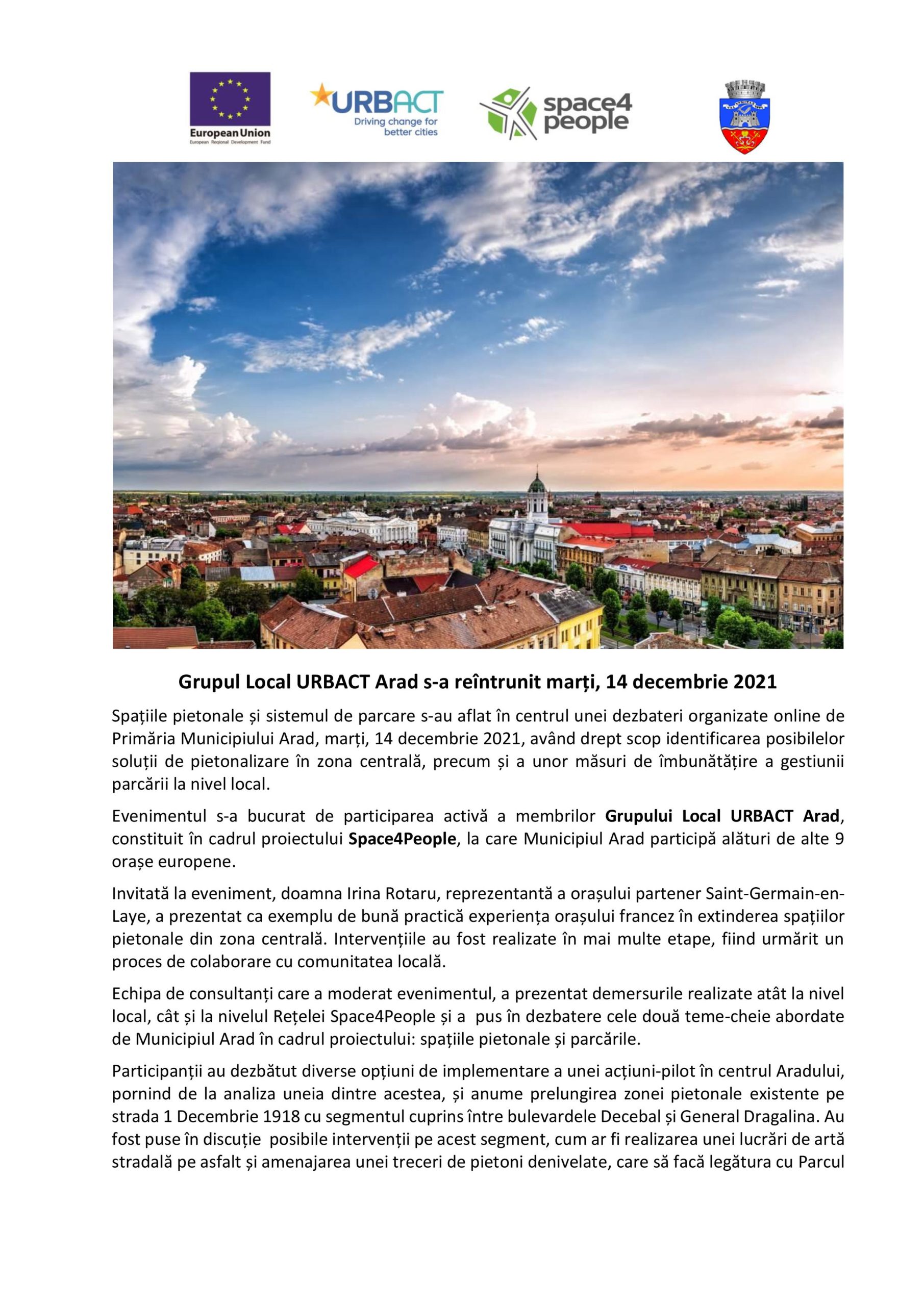 Grupul Local URBACT Arad, principalul motor al procesului de planificare a unor măsuri locale pentru îmbunătățirea spațiului public, a fost constituit la începutul anului 2020 și este alcătuit din 29 de reprezentanți ai administrației locale și societăților din subordinea Consiliului Local (Recons, CTP Arad, și ai altor instituții și organizații active în planificarea și implementarea proiectelor în domeniul mobilității urbane durabile: Inspectoratului Județean de Poliție Arad – Serviciul Rutier), ADR Vest, Agenția pentru Protecția Mediului Arad, Asociația PRO URBE, Asociației Handicapaților Neuromotor din România, asociațiile „Temerarii” și „Experiența Multisport”, Comitetul de părinți al Colegiului Național „Elena Ghiba Birta”, Comitetul de părinți al Colegiului Economic Arad, Cabinete medicale școlare.