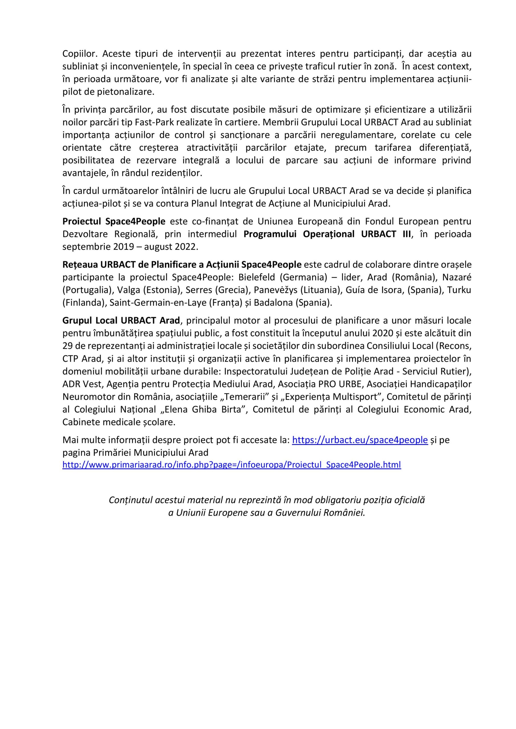 Mai multe informații despre proiect pot fi accesate la: https://urbact.eu/space4people și pe pagina Primăriei Municipiului Arad http://www.primariaarad.ro/info.php?page=/infoeuropa/Proiectul_Space4People.html