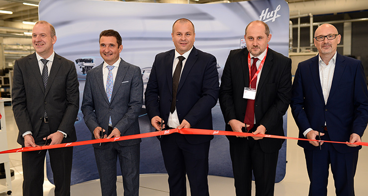 Inaugurarea noilor spații de producție Huf Romania în cadrul fabricii din Arad de către Dr. Lars Placke (CPO Huf), Călin Bibarț (Primarul Arad), Nicolae Viașu (Director Huf Romania), Csaba Toth (Prefect Arad), Dirk Fischer (COO Huf)