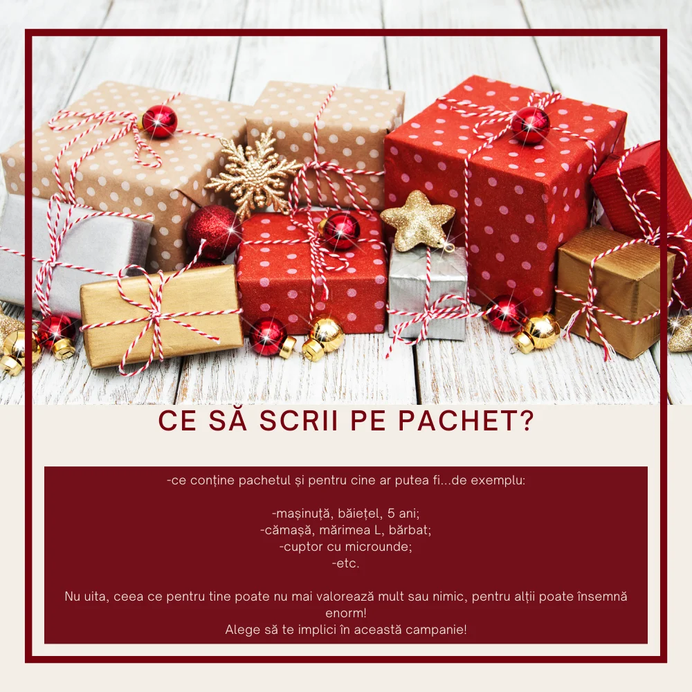 Anul acesta puteți pregăti unul sau mai multe cadouri pentru sufletele pe care nu le cunoașteți, dar pe care le puteți bucura. Dacă aveți haine, jucării sau electrocasnice pe care nu le mai folosiți, dar care se află într-o condiție bună și pot fi utile, nu uitați că reprezintă o infinitate pentru cei care simt povara lipsei. Puteți dona orice simțiți, totul contează. Dacă considerați că puteți dărui mai mult în pragul sărbătorilor, un obiect nou sigur va face diferența atunci când va fi deschis.