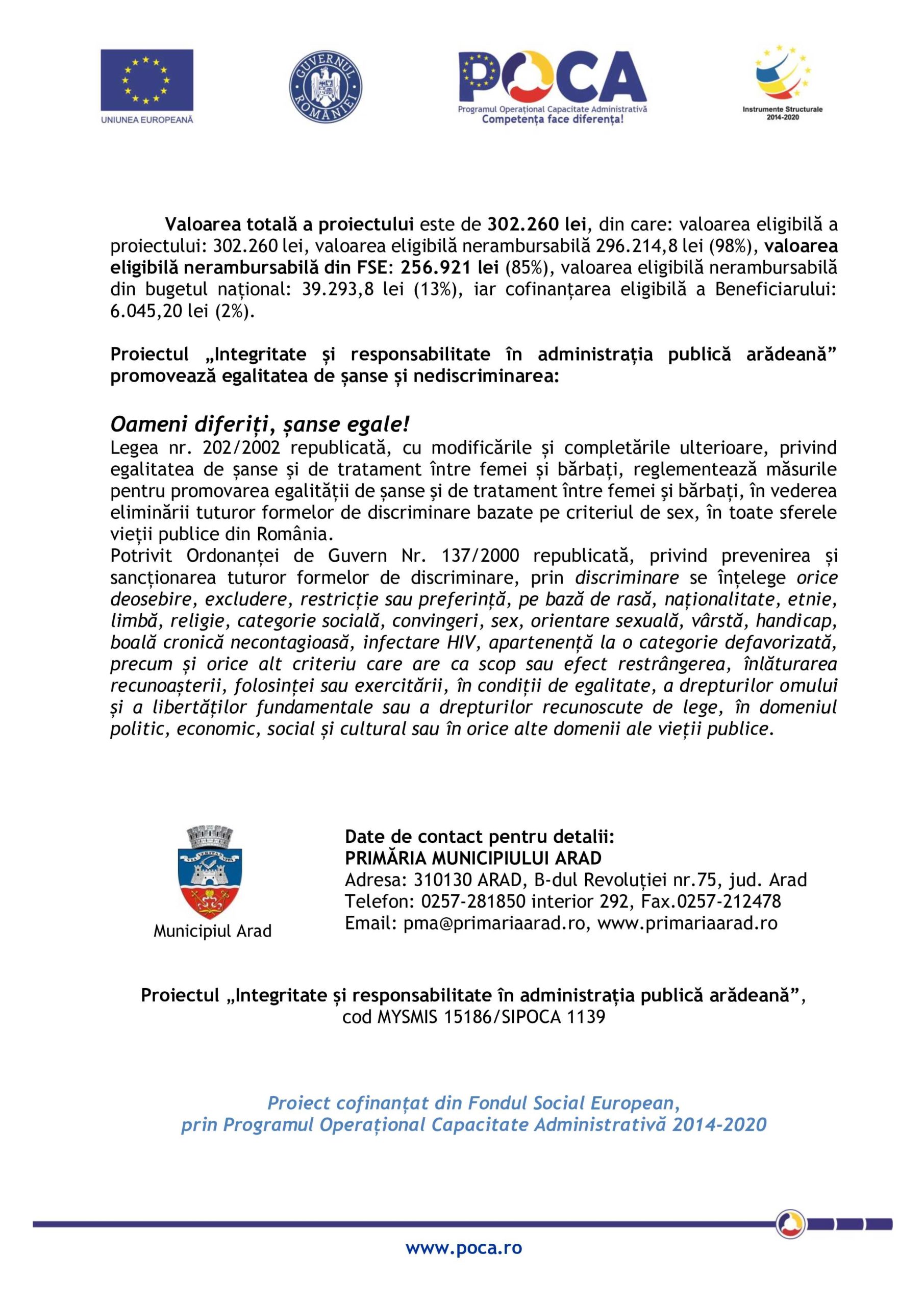 Proiectul „Integritate și responsabilitate în administrația publică arădeană” promovează egalitatea de șanse și nediscriminarea: