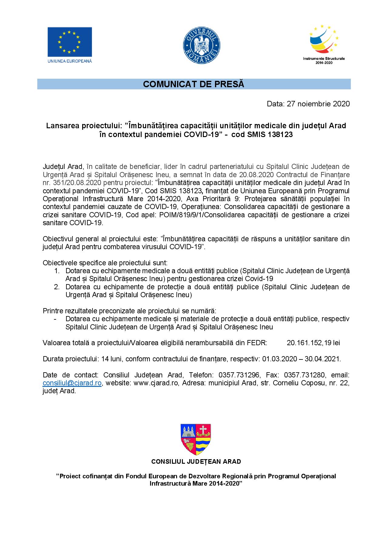 Dotarea cu echipamente medicale a două entități publice (Spitalul Clinic Județean de Urgență Arad și Spitalul Orășenesc Ineu) pentru gestionarea crizei Covid-19