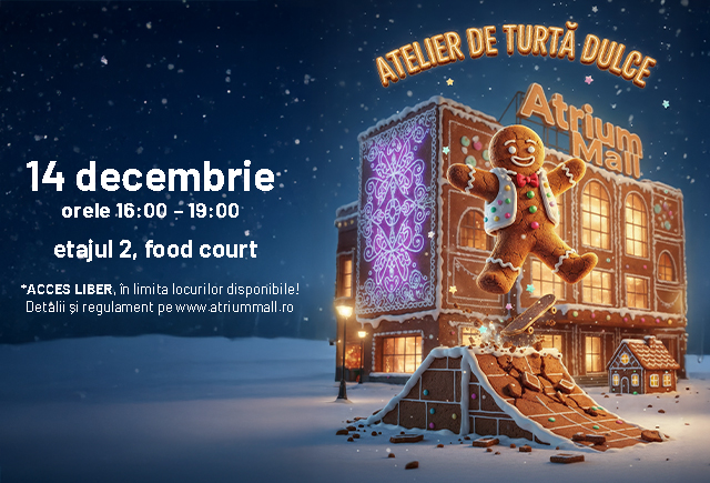 În așteptarea evenimentelor principale, Atrium Mall găzduiește un atelier dedicat copiilor, pe 14 decembrie, între 16:00 și 19:00. Cei mici vor avea ocazia să își pună imaginația la lucru și să decoreze turtă dulce, într-o atmosferă plină de căldură și creativitate.