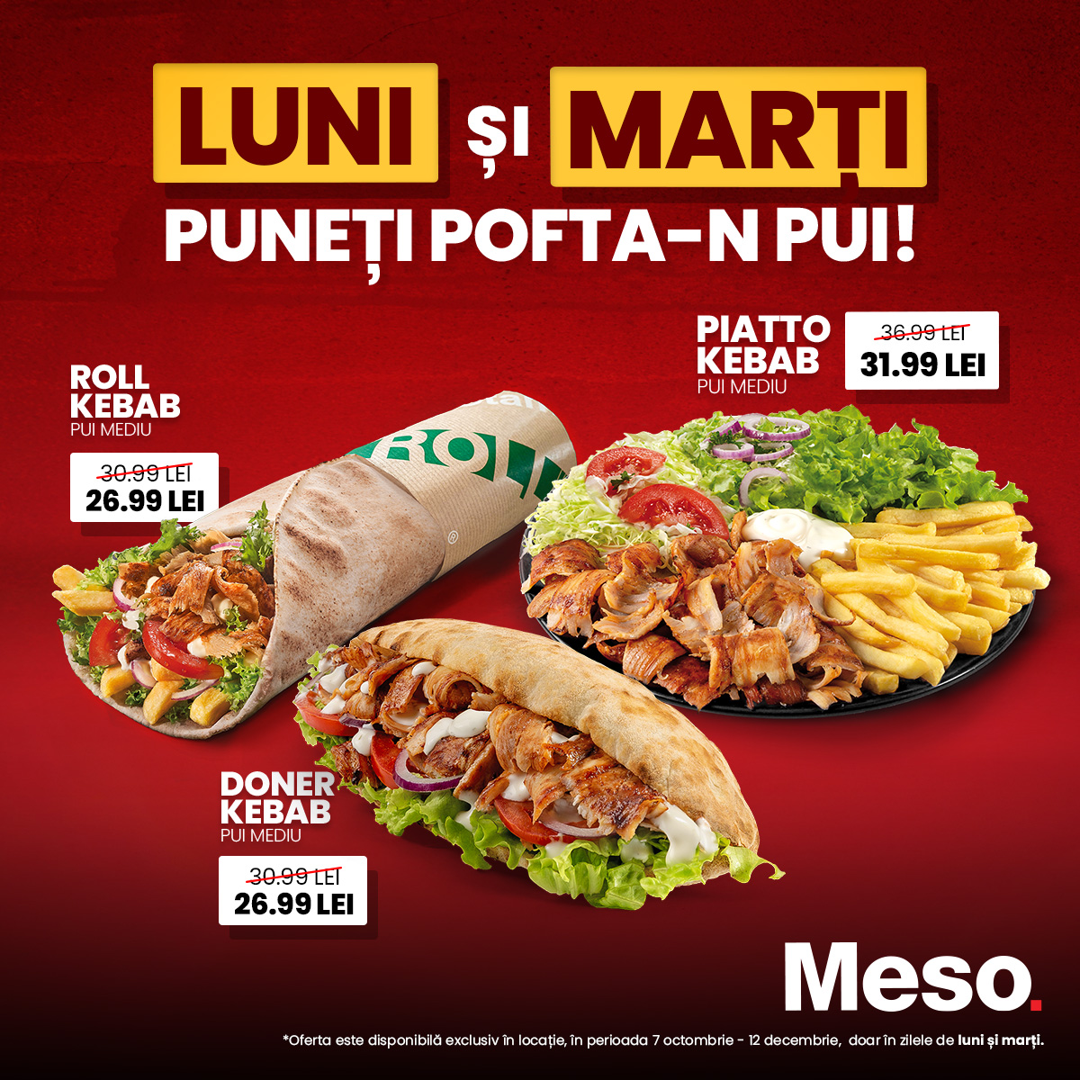 În plus, în fiecare luni și marți, până în data de 12 decembrie, avem o promoție specială la produsele doner kebab, piatto kebab și roll kebab. Mesopotamia va continua să fie un punct de referință în industria QSR din România, dedicânduse valorilor care l-au consacrat și menținându-și angajamentul de a oferi cea mai bună experiență culinară.