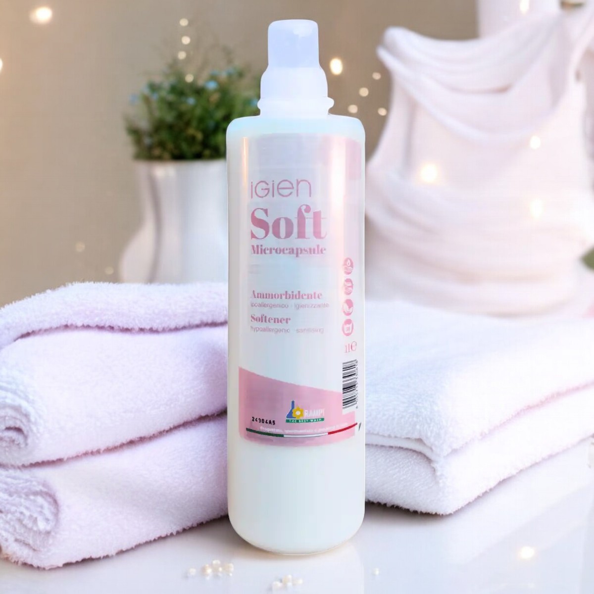 Balsamul de rufe igienizant,hipoalergenic,microcapsule la ambalaj de 1,5 sau 15 L L Sapoigiensoft Microcapsule este un balsam igienizant profesional cu tehnologie avansată pe bază de microcapsule parfumate, care eliberează treptat aroma în contact cu mișcarea materialului. Ideal pentru utilizatorii, care caută prospețime pe termen lung, alături de îngrijire și igienizare completă a țesăturilor. Este recomandat și bebelușilor!