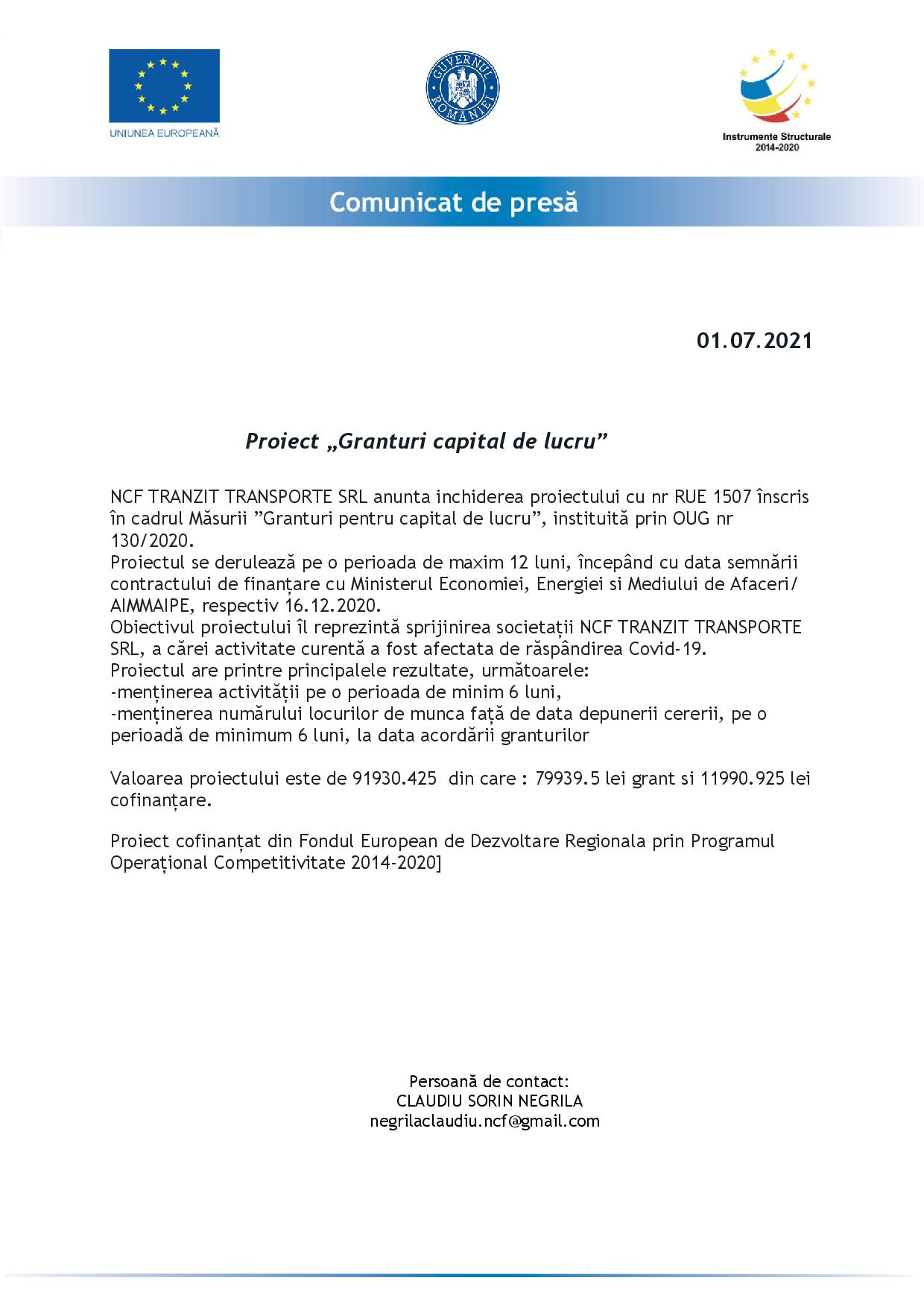 Granturi pentru capital de lucru acordate IMM-urilor” din ca- drul schemei de ajutor de stat instituite prin ORDONANTA nr. 130 din 31 iulie 2020 privind unele masuri pentru acordarea de sprijin financiar din fonduri externe nerambursabile, afe- rente Programului Operational Competitivitate 2014-2020, in contextul crizei provocate de COVID-19.