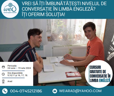 Noi îți oferim soluția: World English Institute, din Statele Unite ale Americii, trimite în echipe de voluntari care predau cursuri de limba engleză în câteva oraşe din România. Anul acesta, vor avea loc cursuri în Arad, Oradea și Cluj-Napoca în perioada 24 iunie – 19 iulie. Cursurile sunt gratuite.