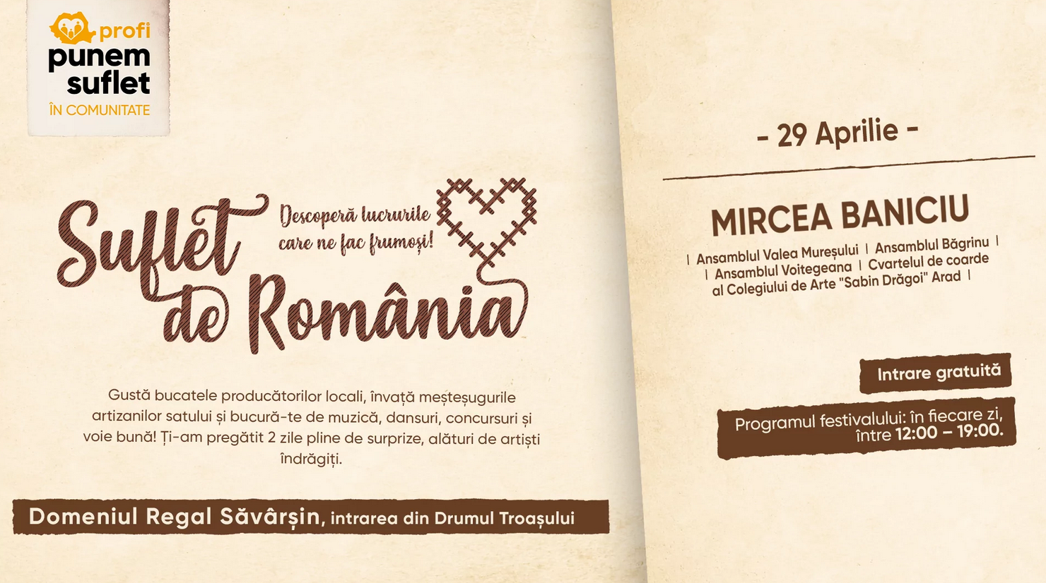 Pe 29 și 30 aprilie, între orele 12:00 – 19:00, festivalul Suflet de România le oferă participanților ocazia să călătorească într-un sat atemporal, în vremea Șezătorilor de altădată. Profi pune suflet în comunitate și deschide România autentică sub forma unui tur inițiatic în lumea satului, trecând prin Hanul Târgoveților, Târgul satului, Piața satului, Drumul Artizanilor și Ulița copiilor. Suflet de România va fi un loc de întâlnire cu micii producători locali și oferta lor, dar și cu filme românești valoroase, concerte susținute de Mircea Baniciu, Nicu Alifantis, Daniel Julean și Trupa Calendar, alături de ansambluri de muzică populară dar și de muzică clasică, într-o îmbinare eclectică, în măsură să sublinieze complexitatea culturală națională.