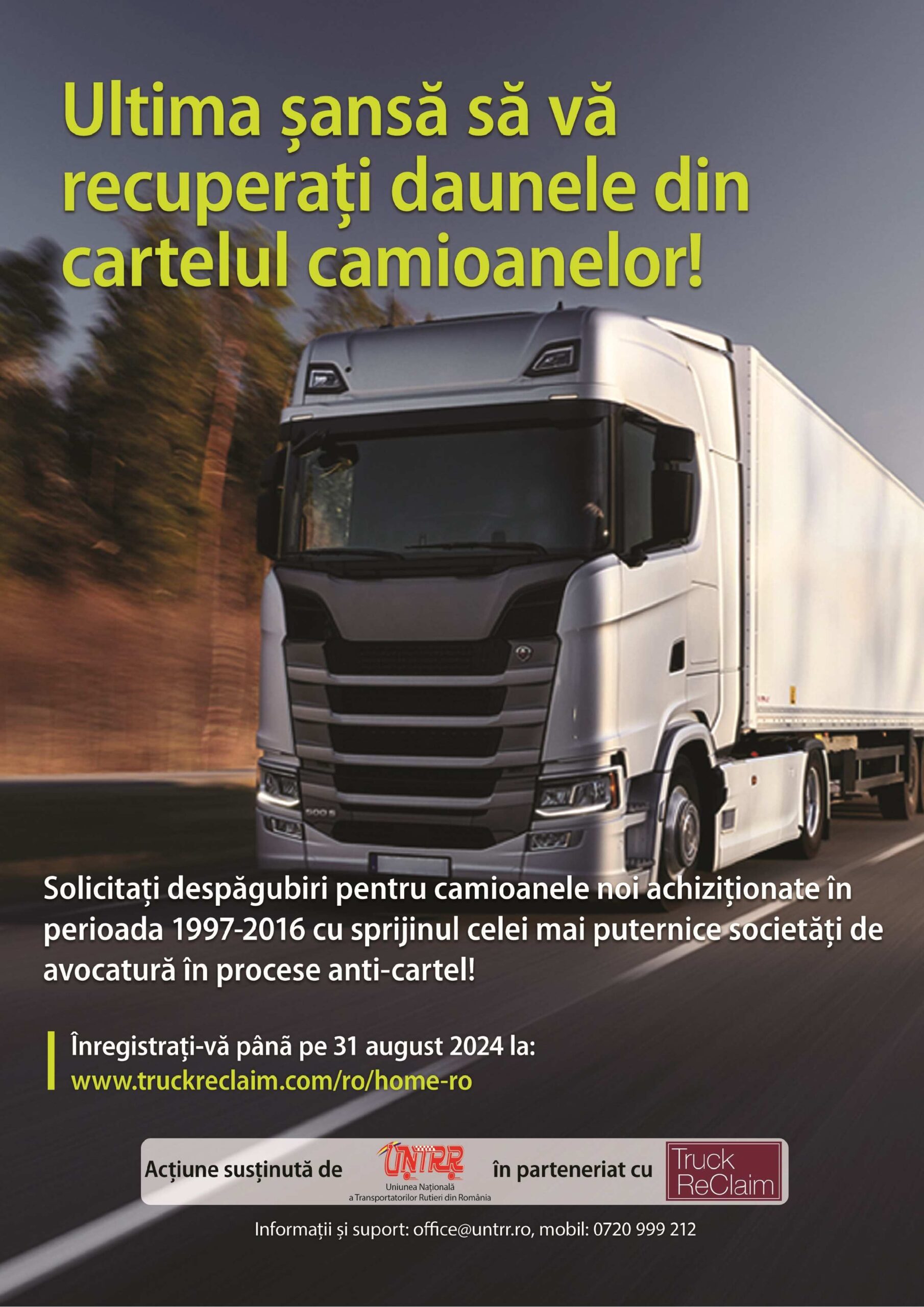 Reamintim că din 2016, după ce Comisia Europeană a decis sancționarea cartelului camioanelor, UNTRR este singura asociație din România care a venit în sprijinul firmelor de transport rutier de marfă prin implicarea în acțiunile juridice împotriva cartelului camioanelor. Transportatorii rutieri români înregistrați la UNTRR au avut posibilitatea de a solicita despăgubiri pentru perioada 2004 – 2016, iar sute de procese sunt în curs de desfășurare doar în fața instanțelor din Germania.