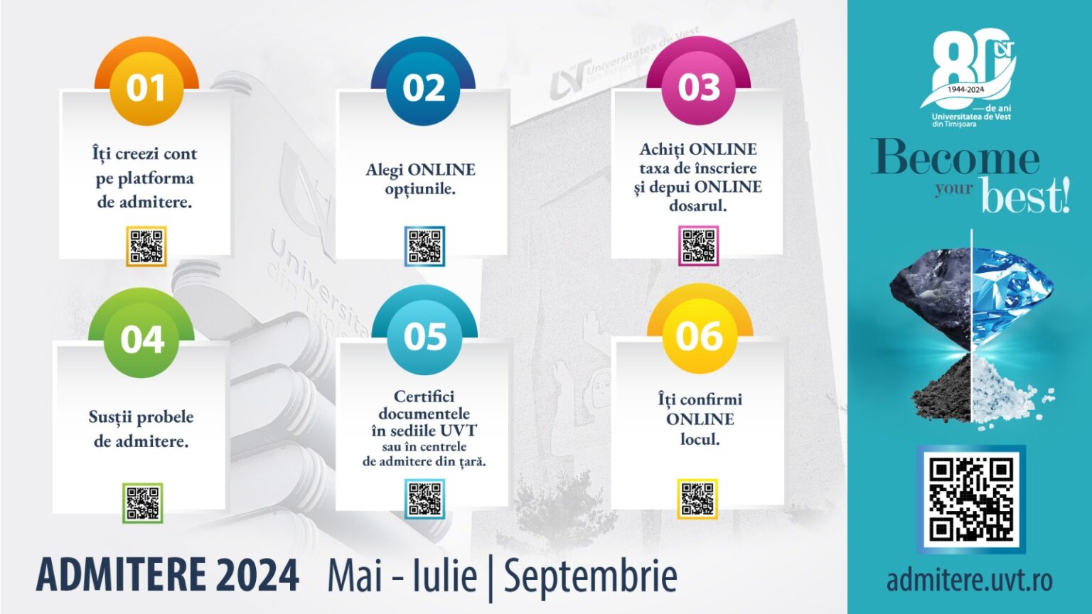 Toate informațiile despre procesul de admitere și oportunitățile pe care UVT le oferă sunt disponibile pe site-ul UVT dedicat procesului de admitere – admitere.uvt.ro.