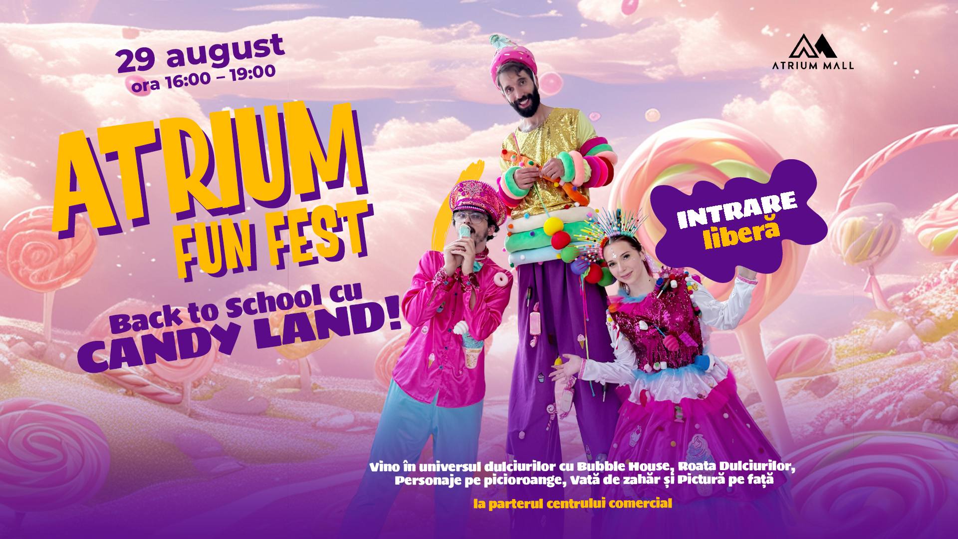Orele 16:00 – 19:00 – Candy Land: Bubble House, Roata Dulciurilor, personaje pe picioroange, vată de zahăr și pictură pe față – parter