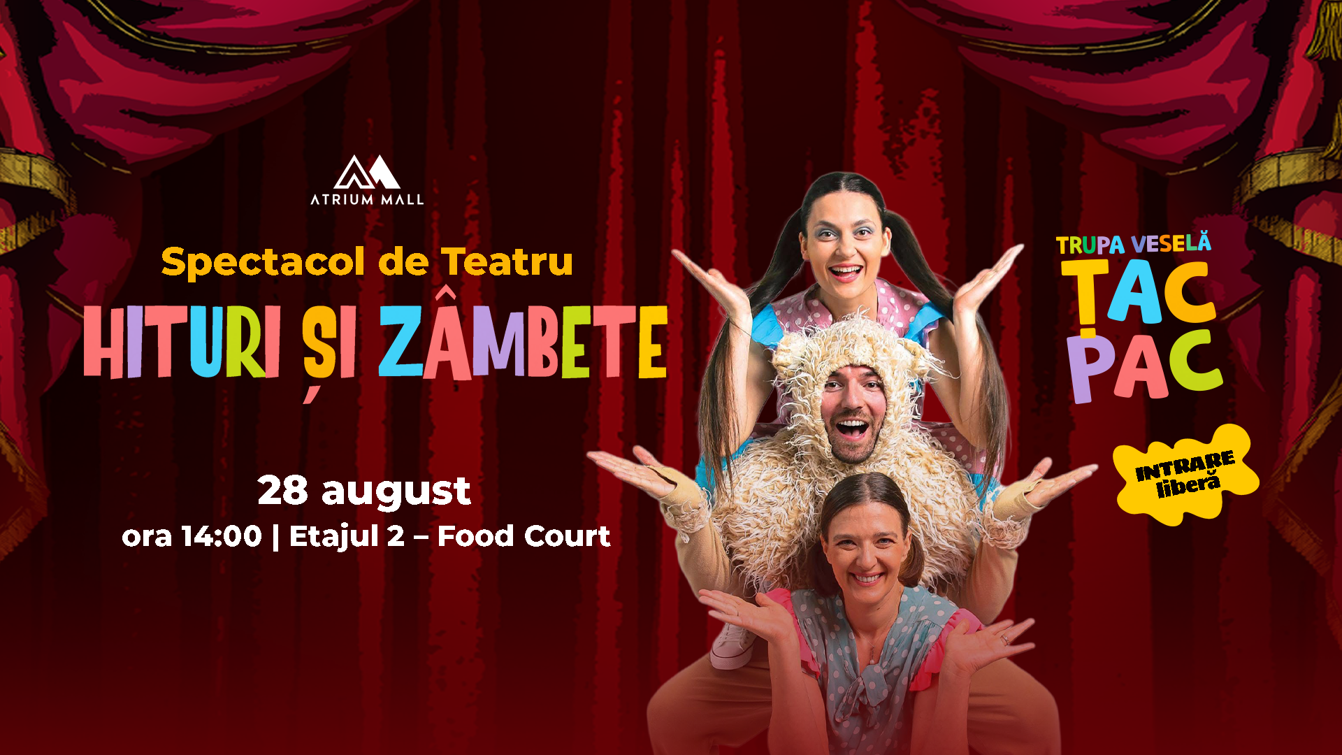Ora 14:00 – Spectacol de Teatru cu Trupa Veselă Țac Pac „Hituri și zâmbete” – etajul 2, food court