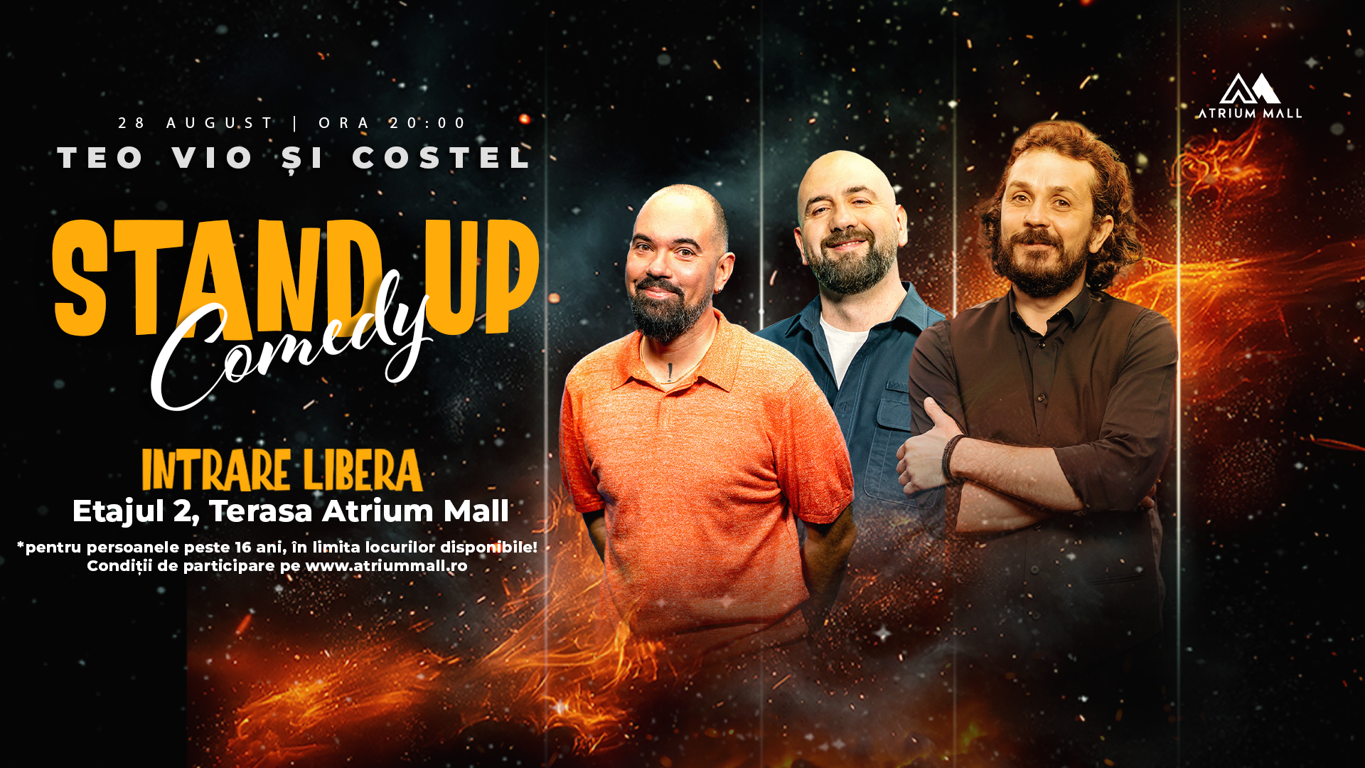 Ora 20:00 – Stand-up Comedy cu Teo, Vio și Costel – terasa food court