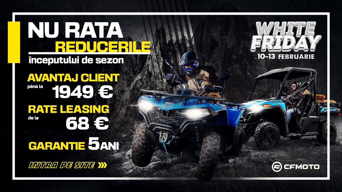 Îți dăm și câteva ponturi, poate îți sunt de folos. Dacă-ți plac ATV-urile sau SXS-urile, atunci trebuie să știi că discounturile depășesc 1000 euro. Dacă iubești aventura pe două roți, aici surprizele sunt și mai mari, discounturile ajung până la 2001 euro. Mai mult decât atât, unele motociclete de enduro, pe lângă reducerile de preț, au și câte un voucher în valoare de 1000 de euro, pe care îl poți folosi pentru achiziția de echipamente și accesorii. Un alt pont este că, gama CFMOTO va avea, în White Friday, 5 ani GARANȚIE. Nu au fost uitați aventurierii care iubesc roadsterele, nici pasionații de vară, de soare, apă și skijet-uri, și nici cei care aleg eficiența în trafic și preferă scuterele. Aruncă-ți un ochi și pe accesorii, au până la 20% reducere, iar echipamentele până la 30%.