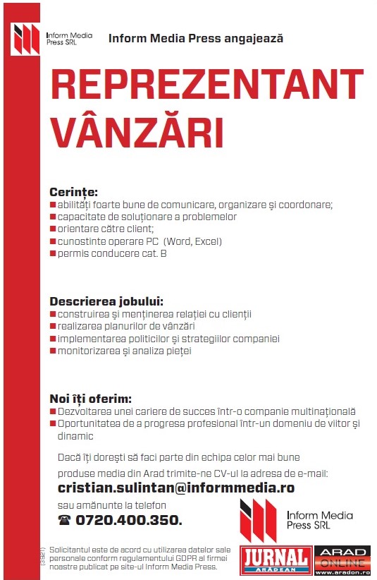 Daca îti doresti sa faci parte din echipa celor mai bune produse media din Arad trimite-ne CV-ul la adresa de e-mail: cristian.sulintan@informmedia.ro sau amanunte la telefon 0720.400.350.