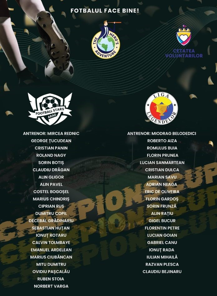 Echipa arădeană va avea în componența lotului nume apreciate, cum ar fi George Țucudean, Cristian Panin, Roland Nagy, Sorin Botiș sau Dumitru Mitu, De cealaltă parte, componența echipei Ligii Legendelor se anunță una stelară, cu nume precum Florin Prunea, Lucian Sânmărtean, Florin Gardoș, Gigel Bucur, Florentin Petre sau Ionuț Rada.
